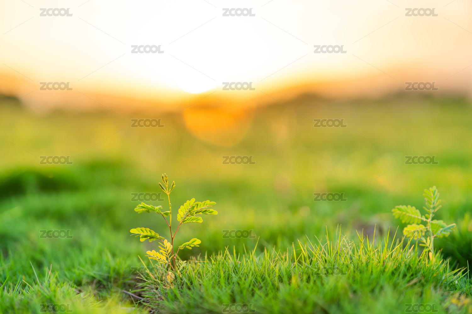 夕阳下草地中的嫩绿幼苗
