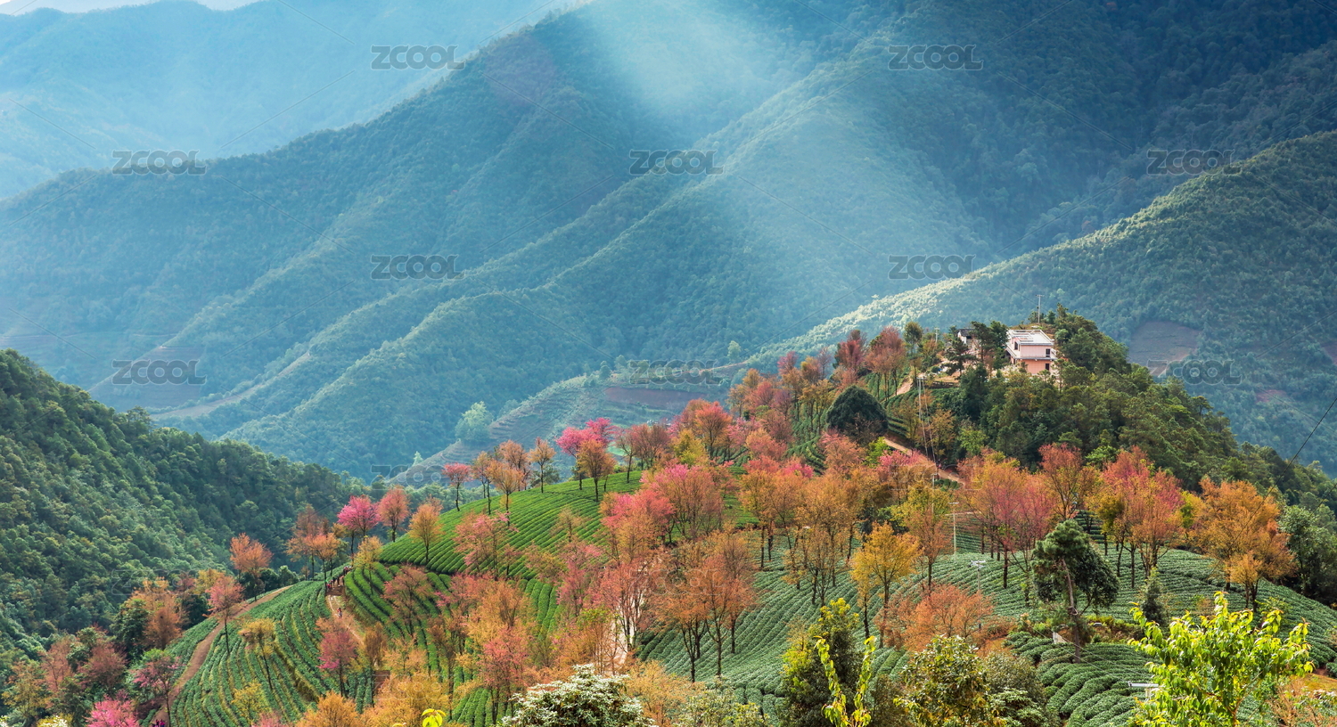 中国,云南,大理,南涧,无量山,茶山,绿色,粉色,樱花树,冬樱花