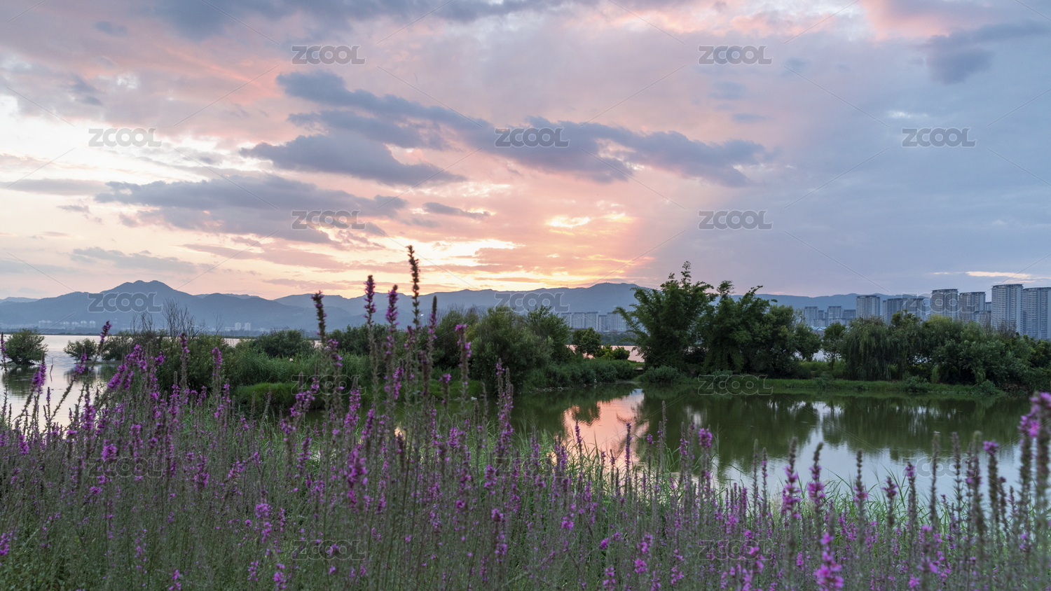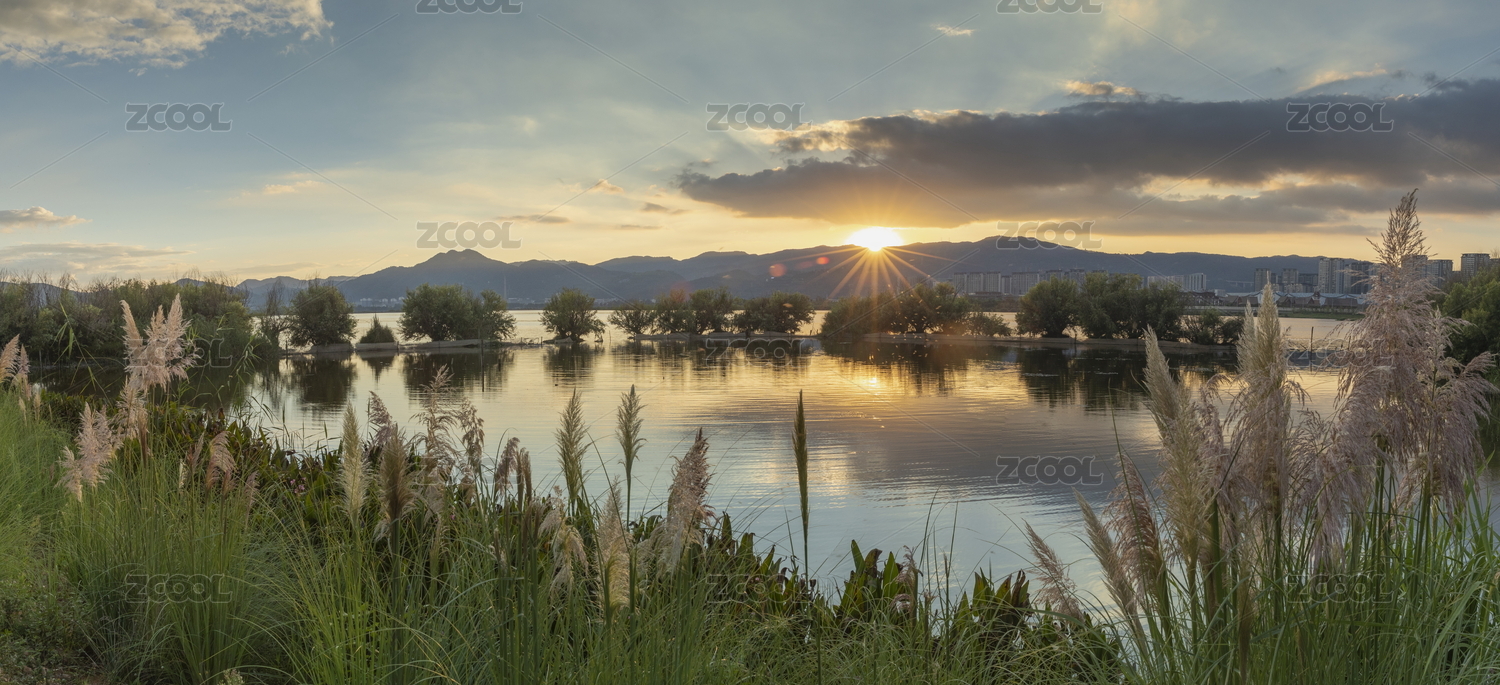 中国云南昆明滇池晚霞霞光水面光影自然风光