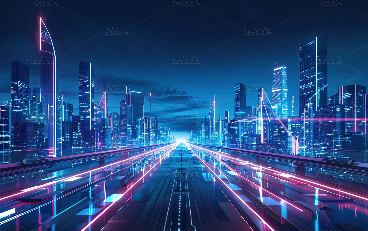 未来城市的夜景霓虹灯勾勒的摩天大楼
