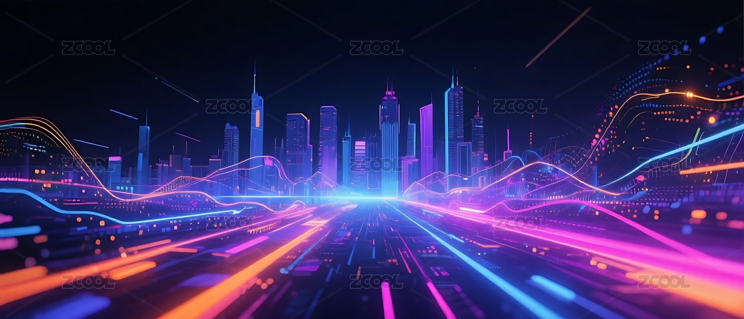 抽象数据流线条发光未来城市轮廓蓝紫色渐变