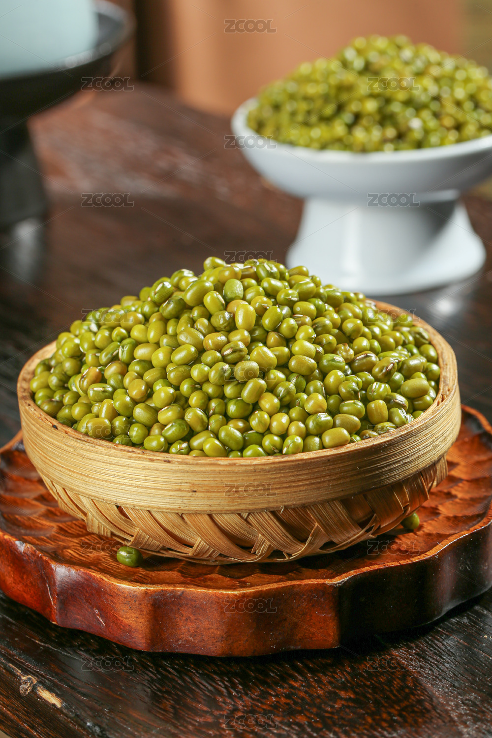 竹席黑色陶瓷福碗里的绿豆