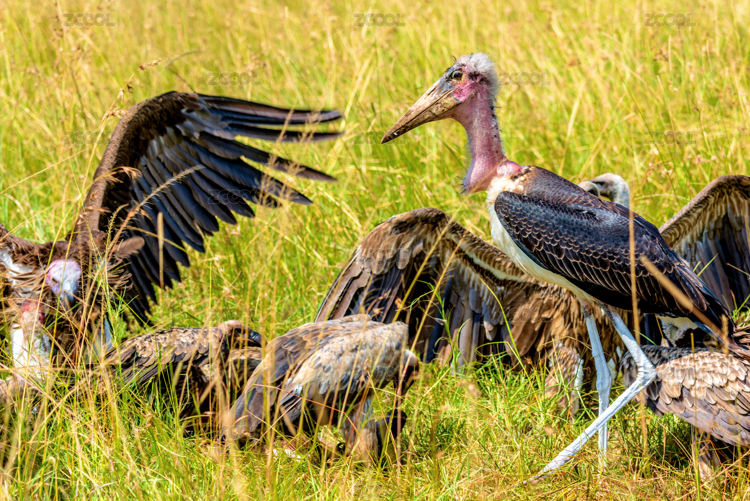 非洲肯尼亚马赛马拉兀鹫和秃鹳的觅食场景