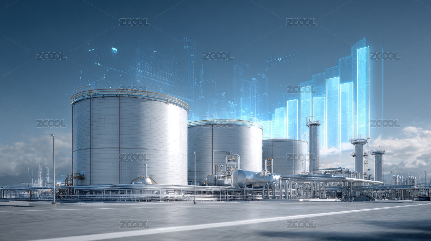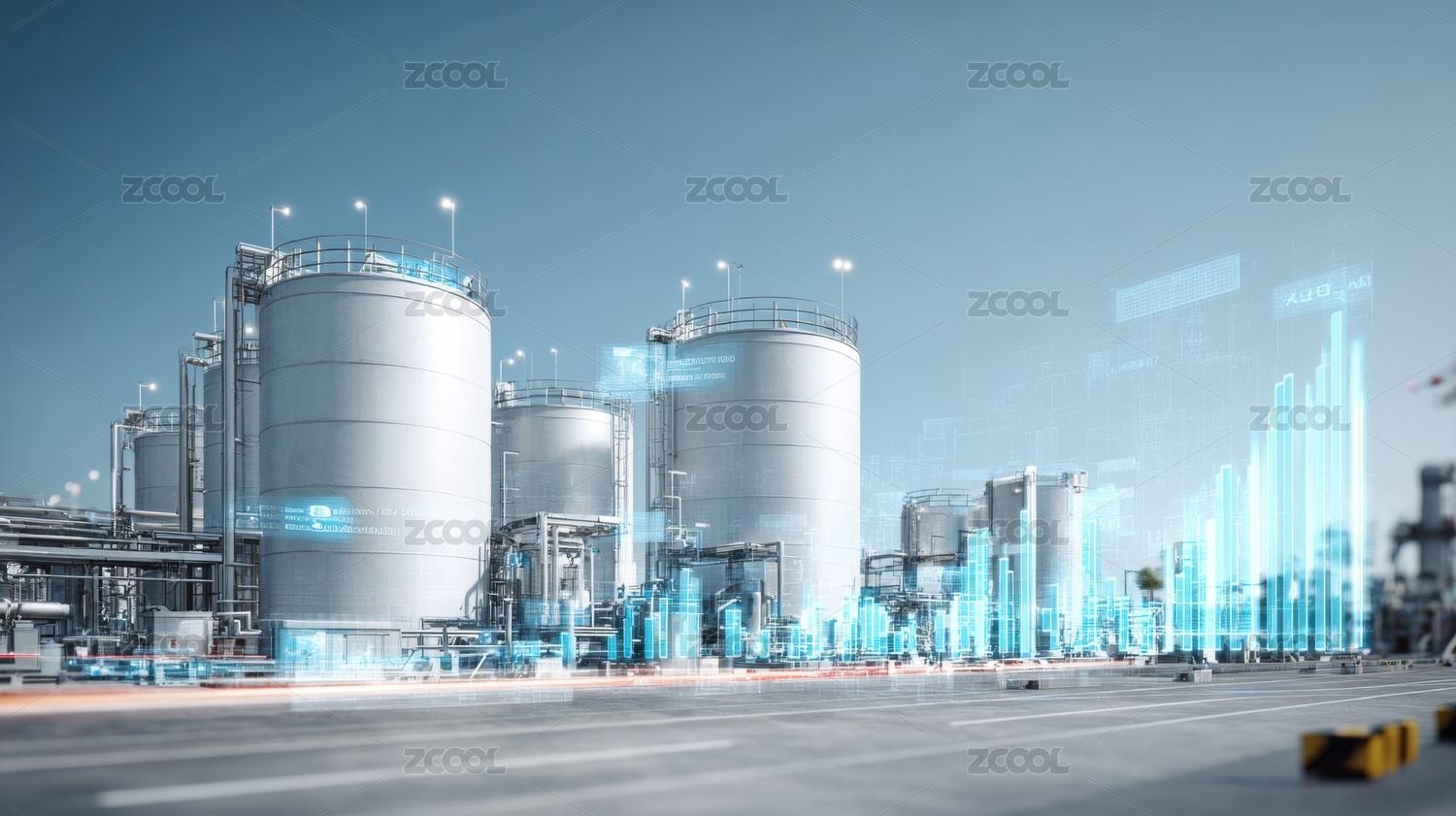 蓝色光影,科技元素,工业储罐,虚拟数据,现代化设施,能源储存,大型设备,未来感设计,环境背景,智能监控