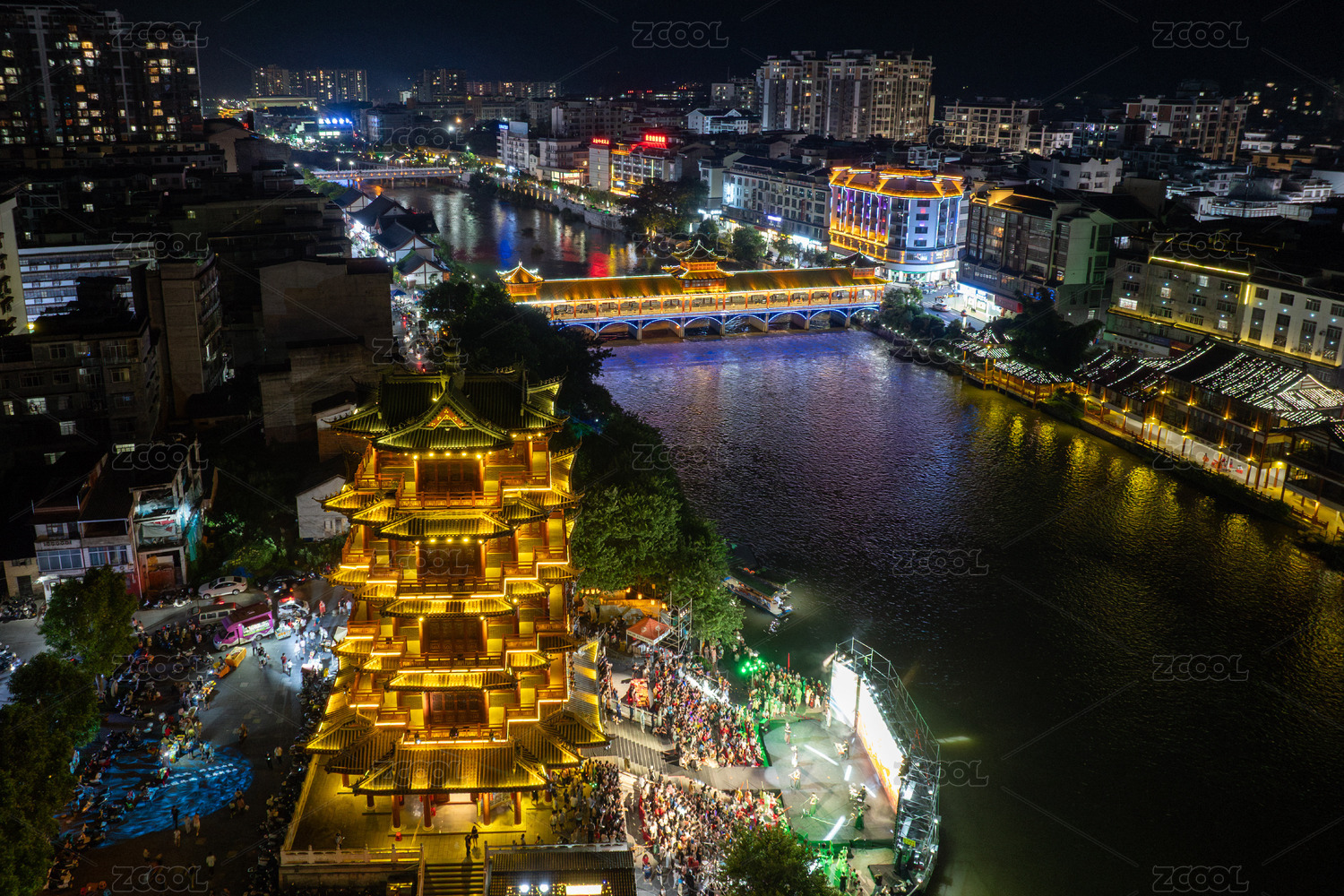 文旅融合,夜间经济,城市烟火气,长寿阁,长寿桥,阁楼,风雨桥,城市地标,城市夜景,古建筑