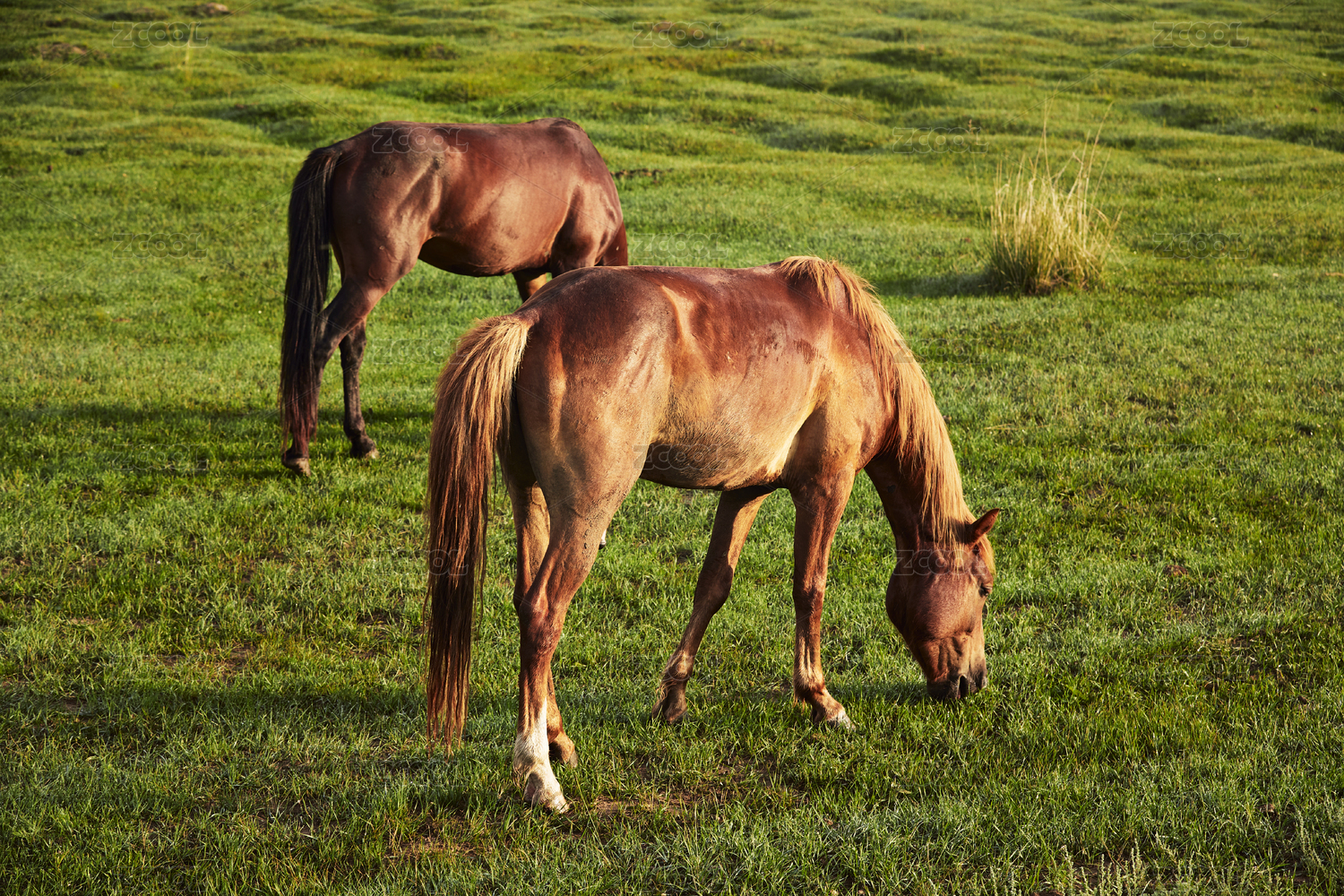 河北省沽源县库伦淖尔景区清晨的草原牧马