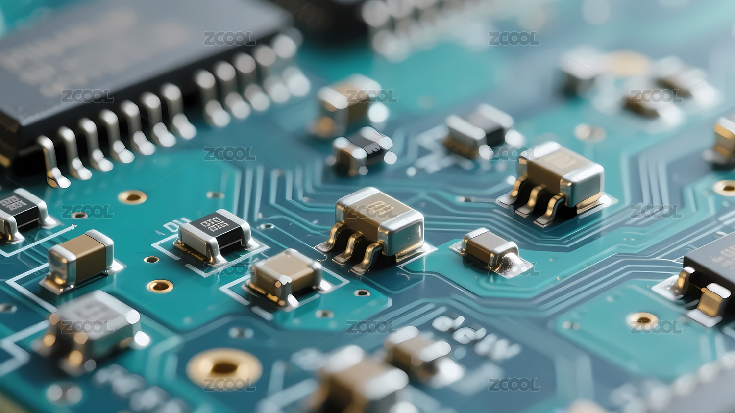 绿色电路板上的电子元件特写