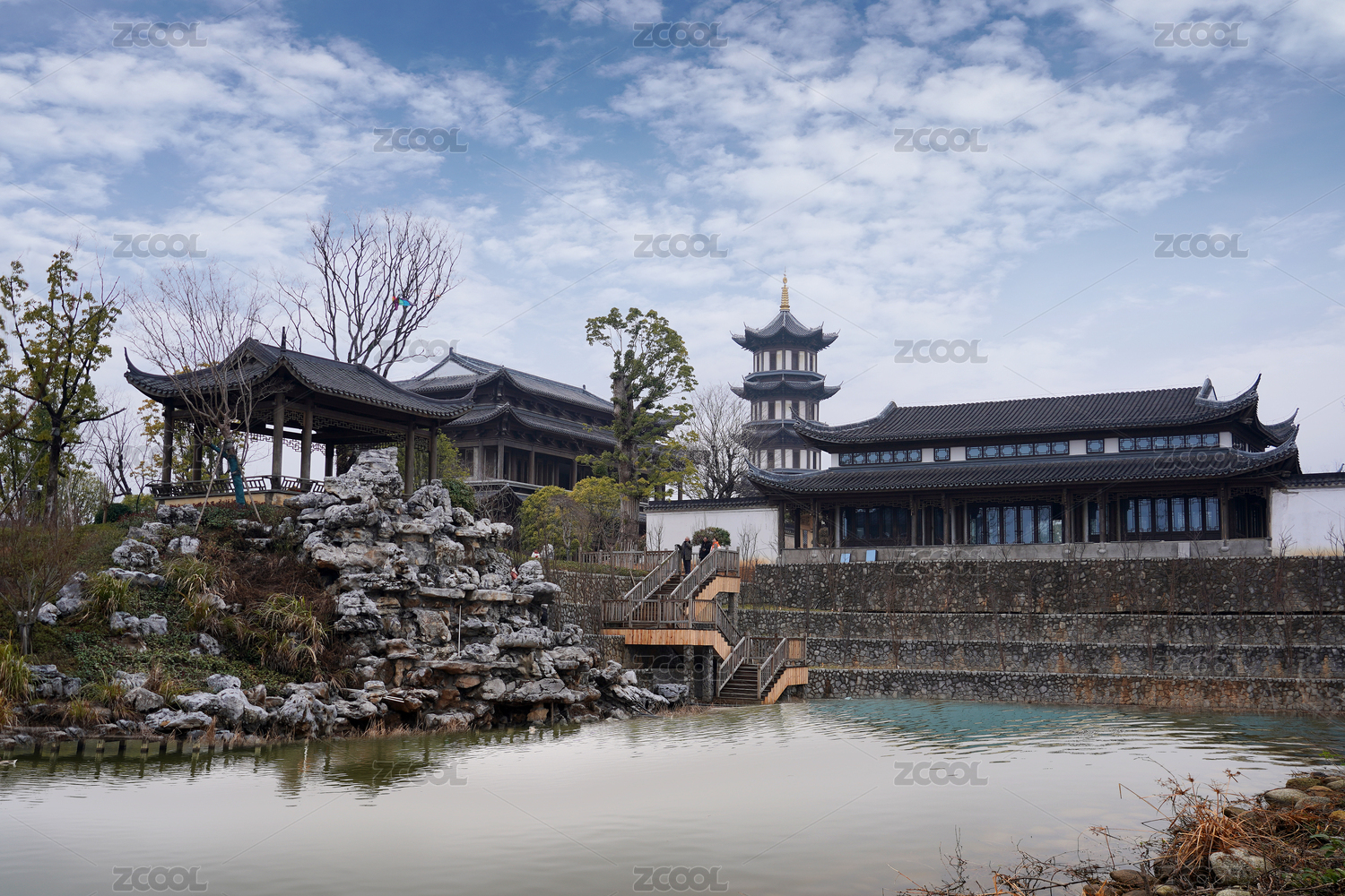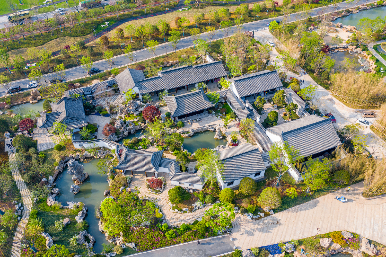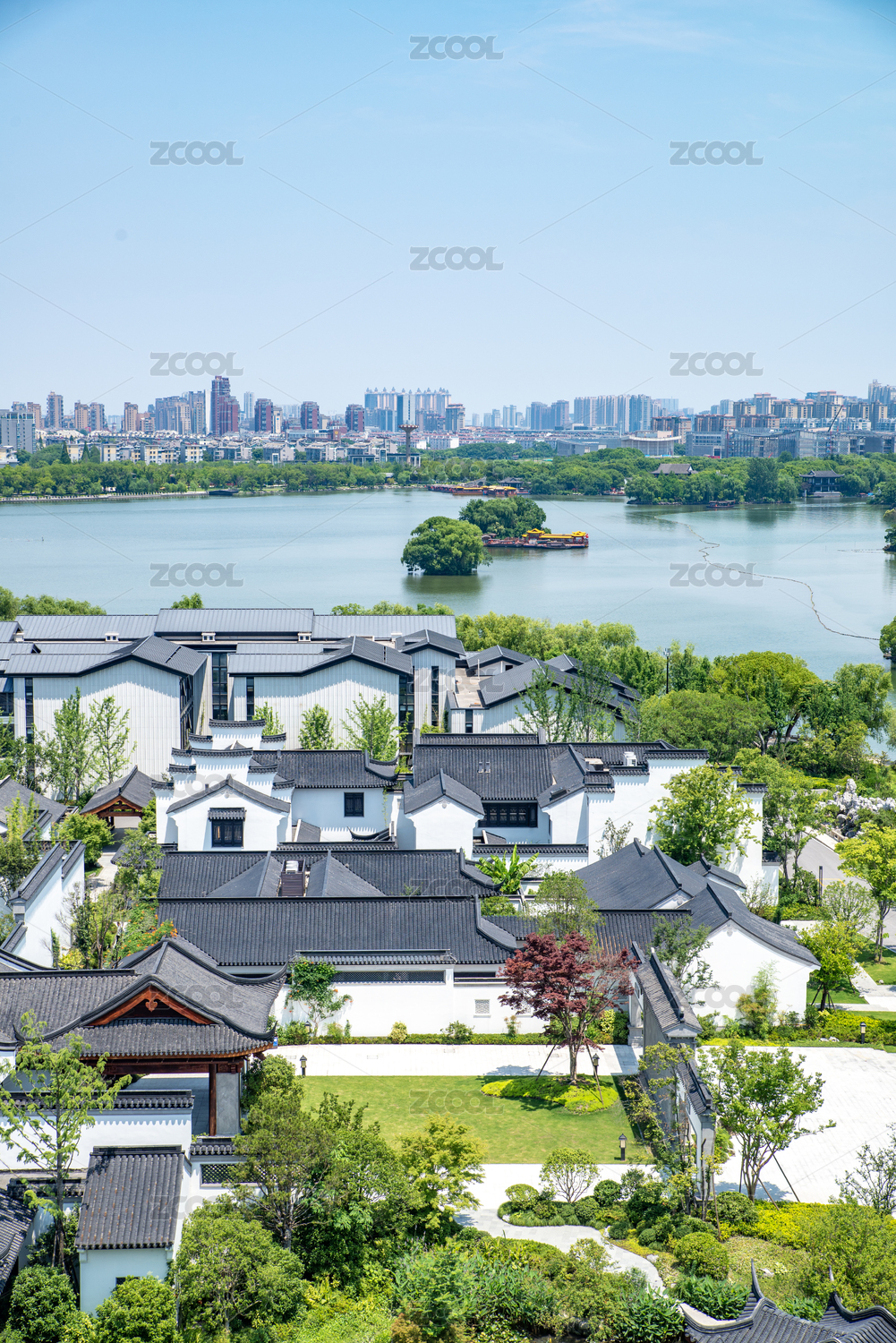 宜兴窑湖小镇湖畔古建筑群生态景观,高视角