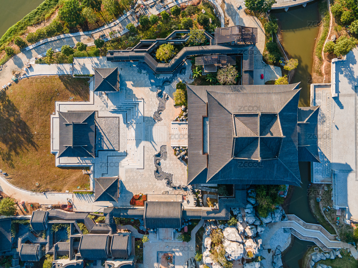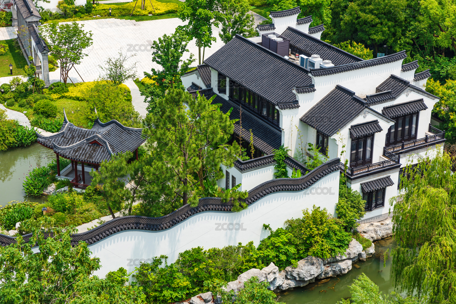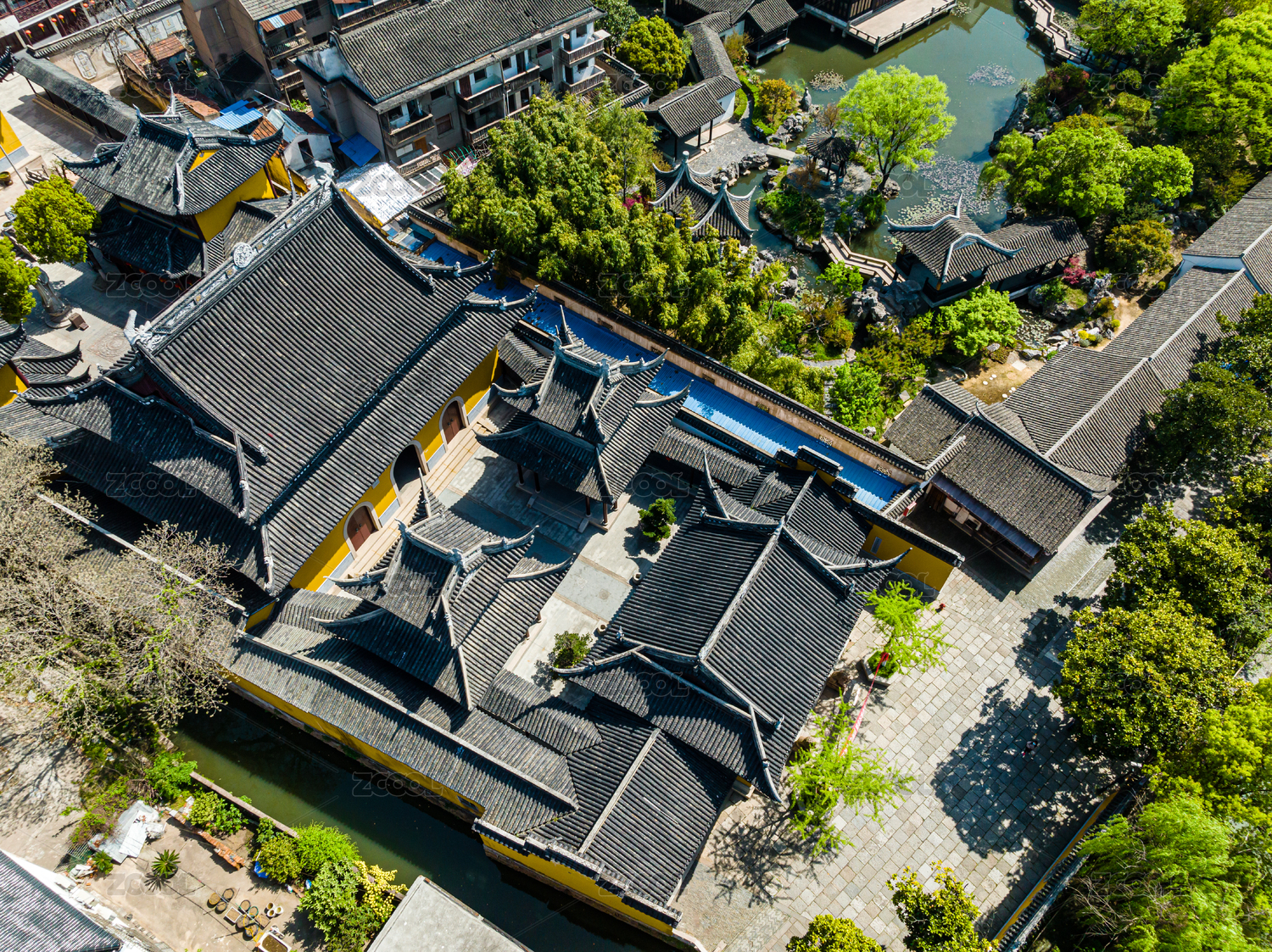 小镇粉墙黛瓦古建筑群生态景观,高视角