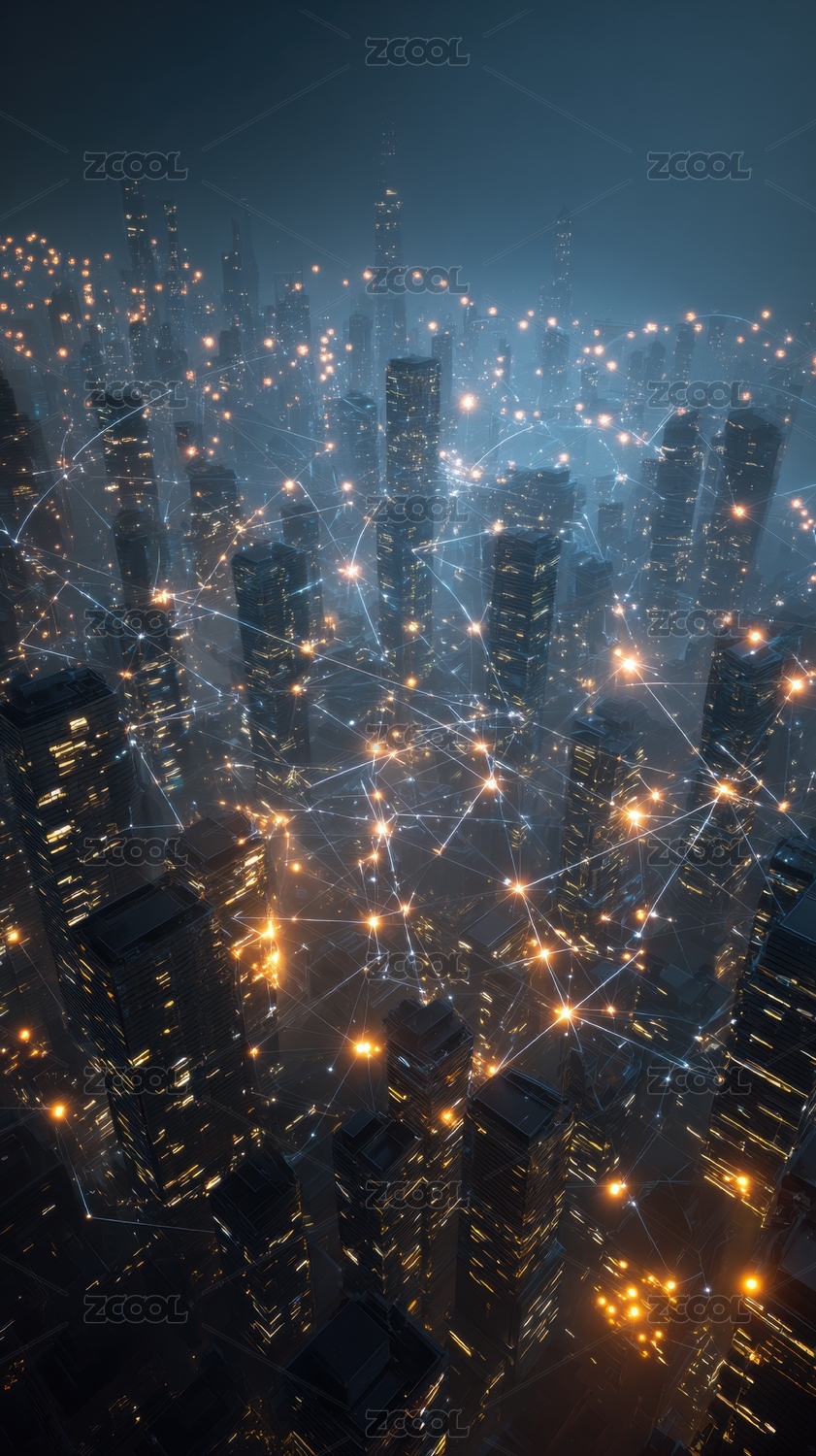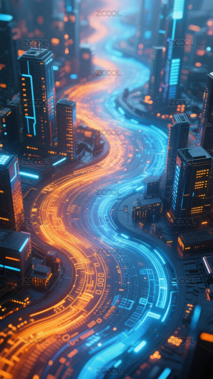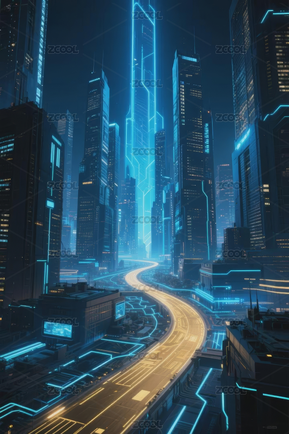 夜晚氛围,现代都市,高楼大厦,未来城市,光轨交错,夜景效果,科技感强,建筑密集,道路蜿蜒,光影流动