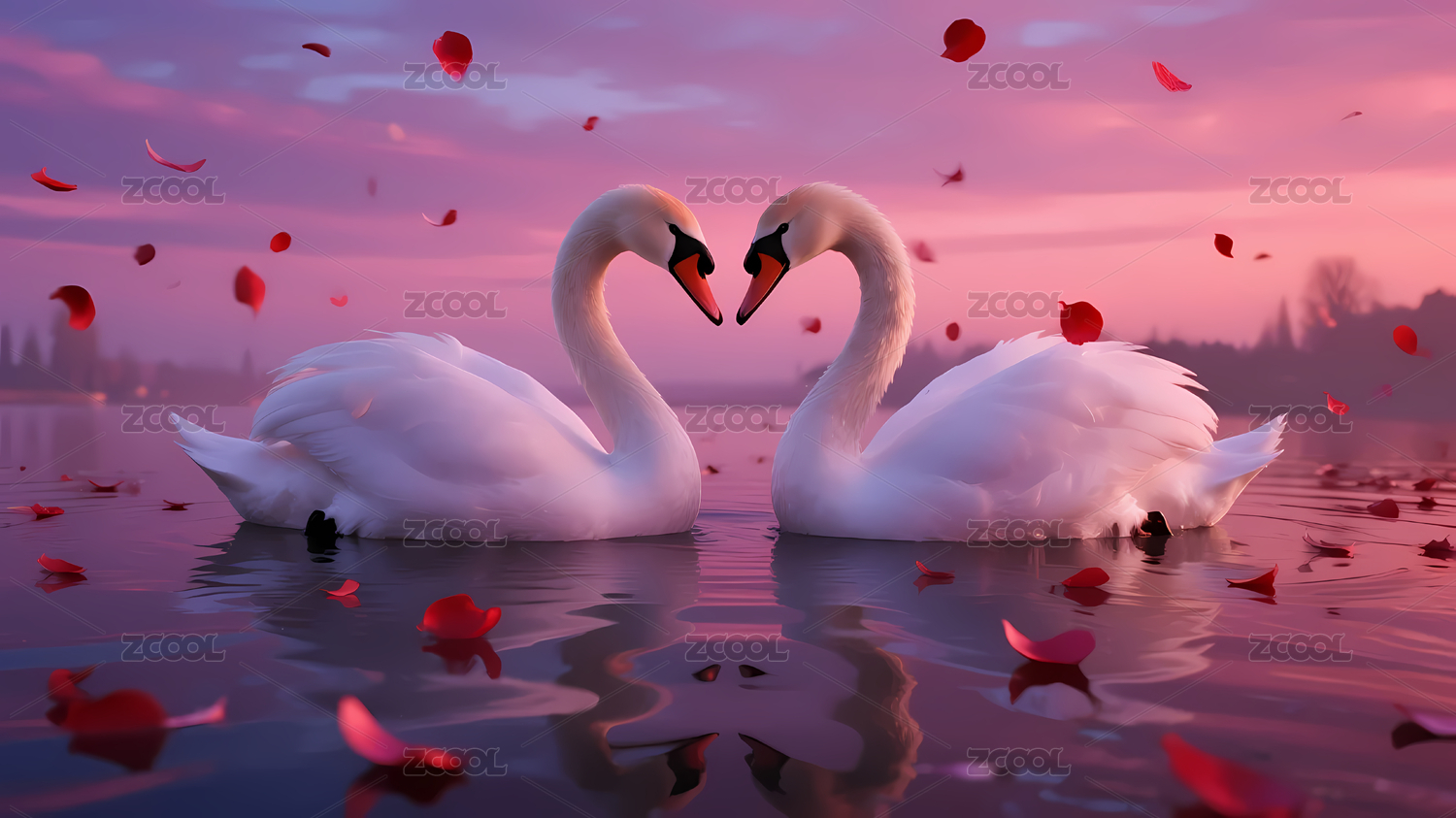 粉色湖面白天白天鹅相依偎浪漫氛围