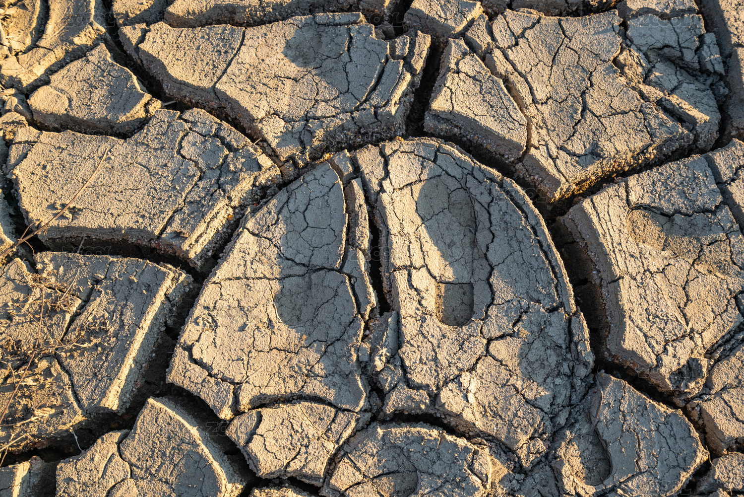 干旱裂开的泥土田地和脚印
