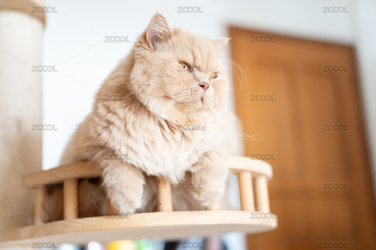 英国长毛猫趴在宠物猫爬架上晒太阳
