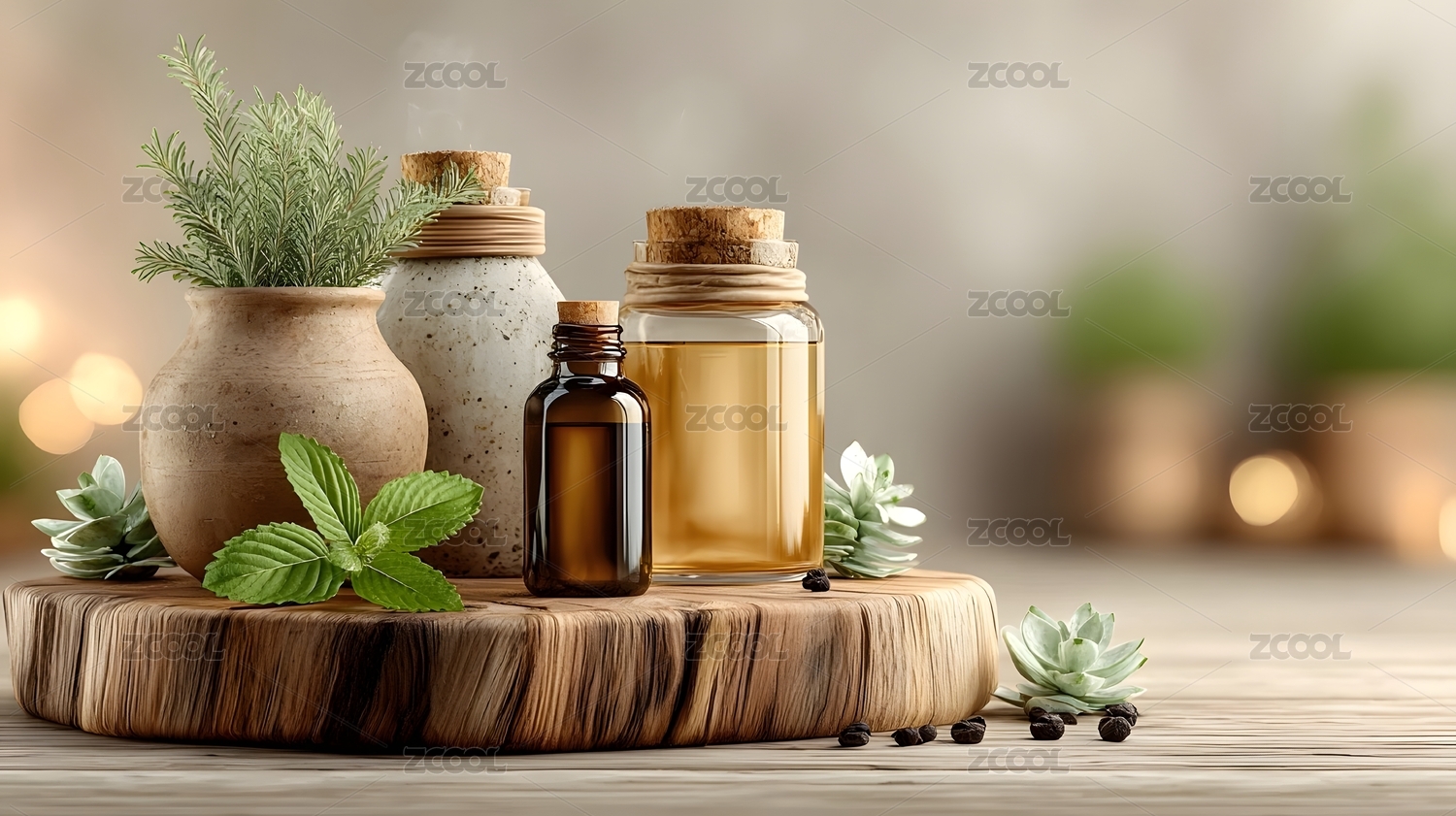 精油瓶与绿叶主题