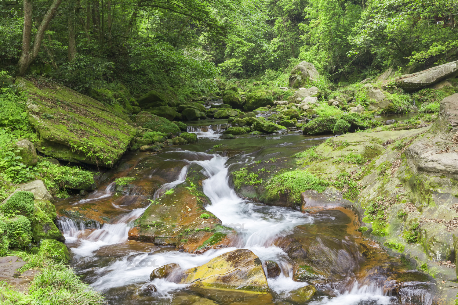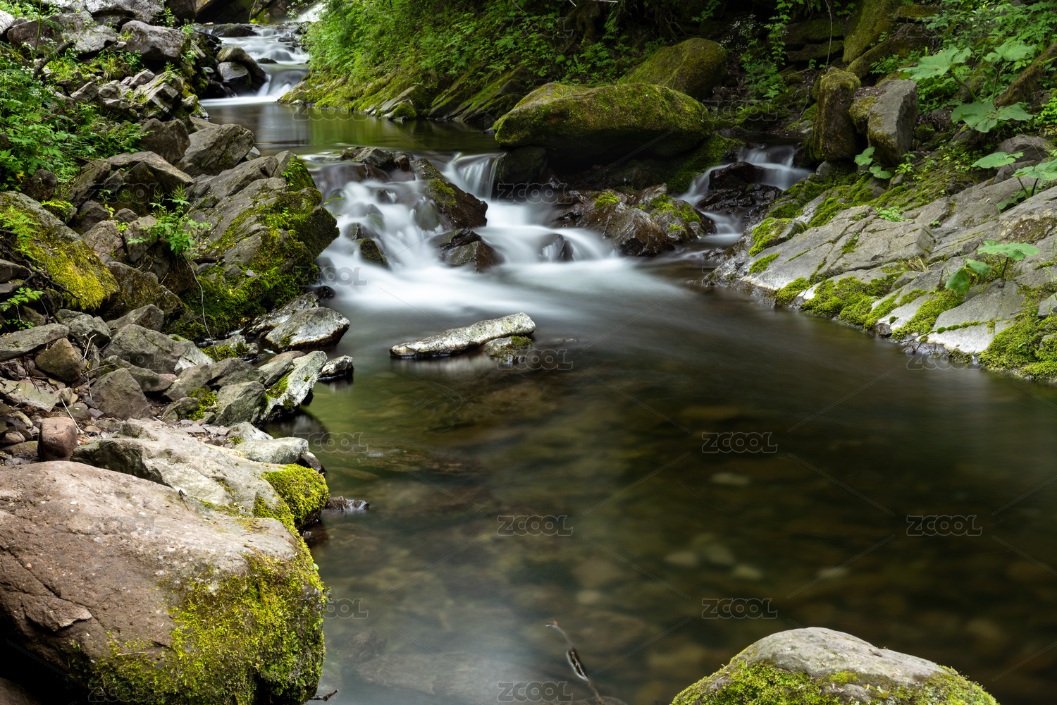 森林中山谷溪流的慢门流水