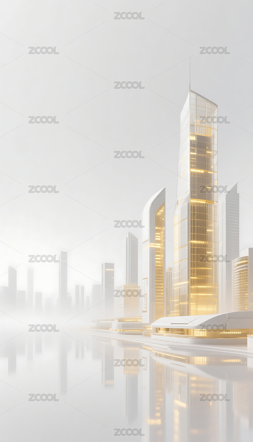 科技感的3D渲染风格金白色调的未来建筑