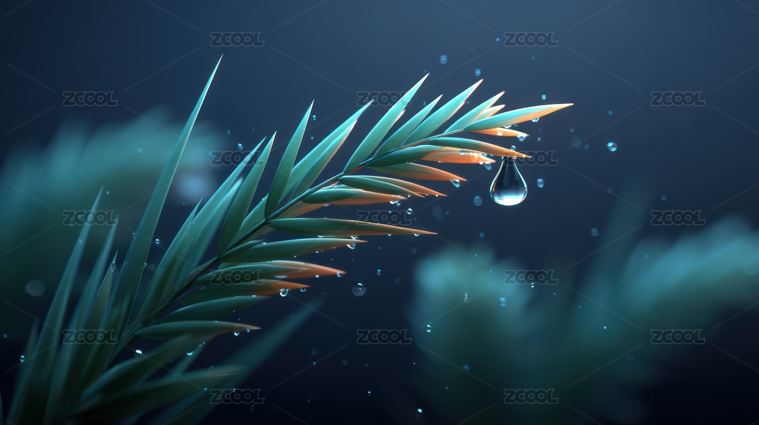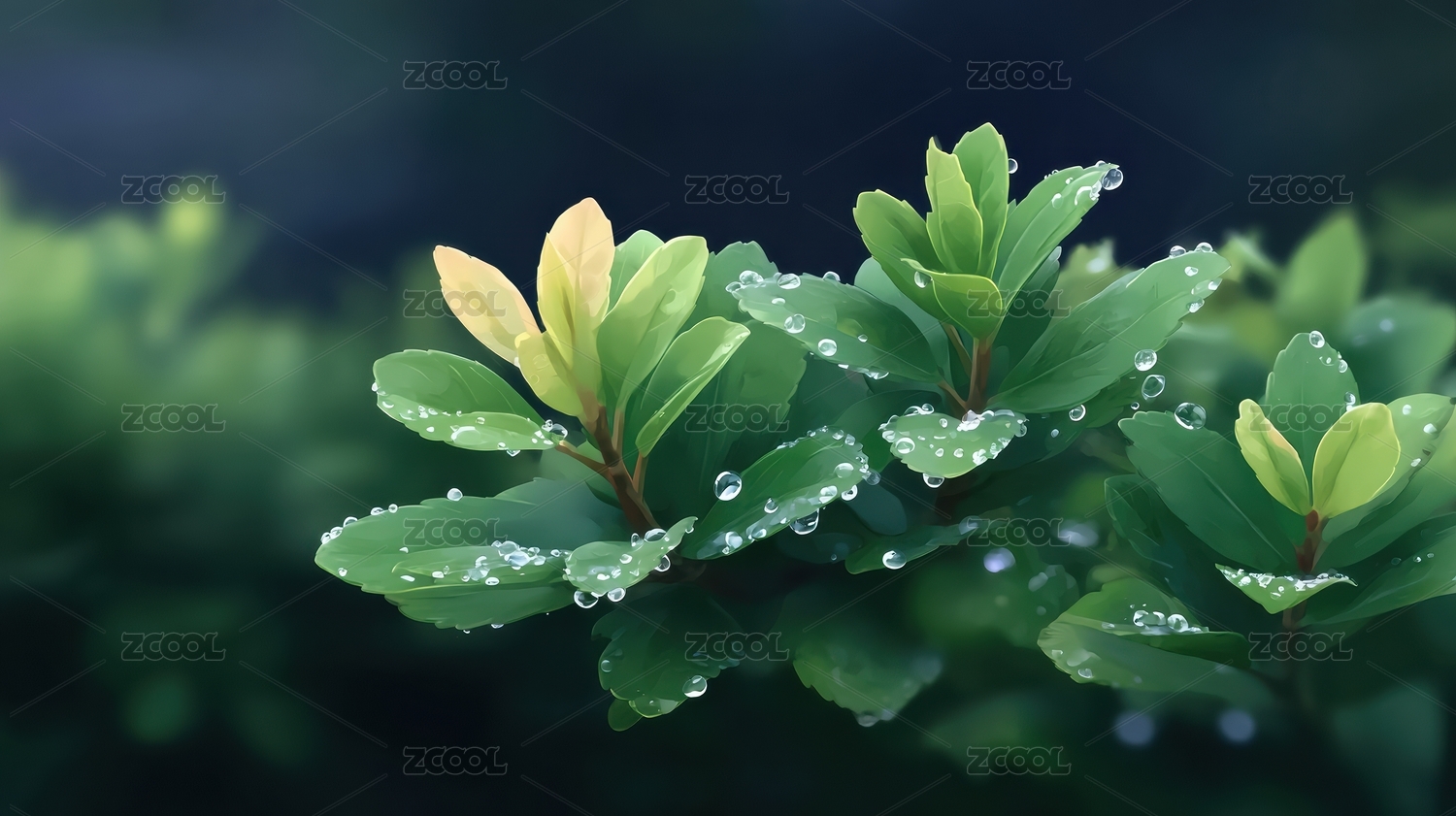 夏天治愈绿色嫩芽叶子上的露珠水珠