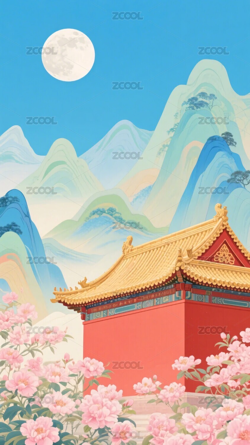 中秋节,国风,圆月,中式,建筑,桂花树,红色背景,红色,中国风,国潮