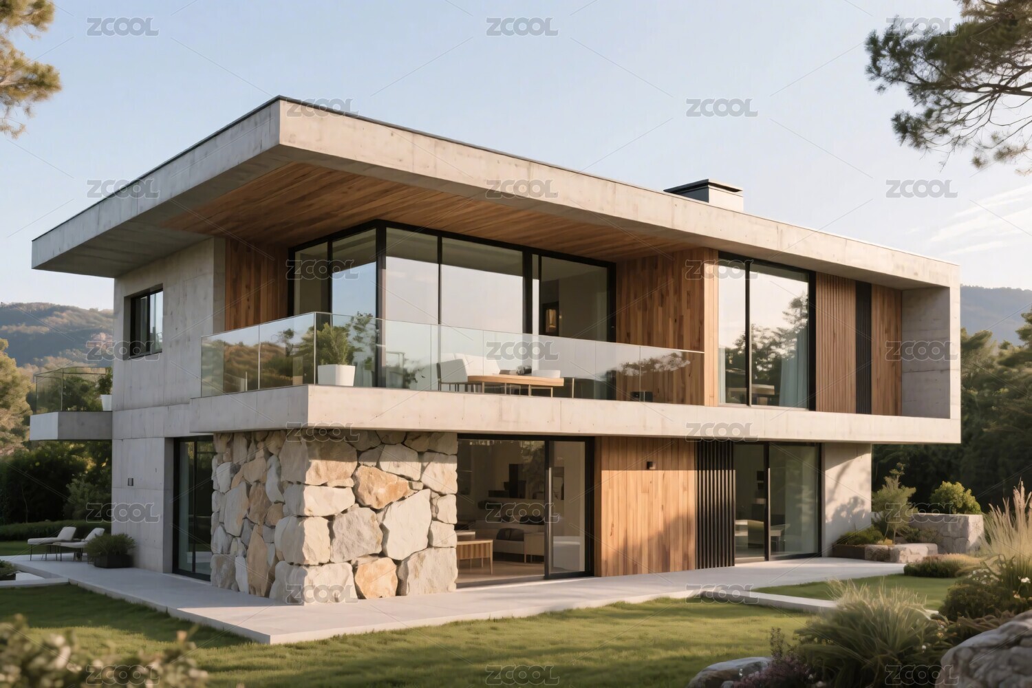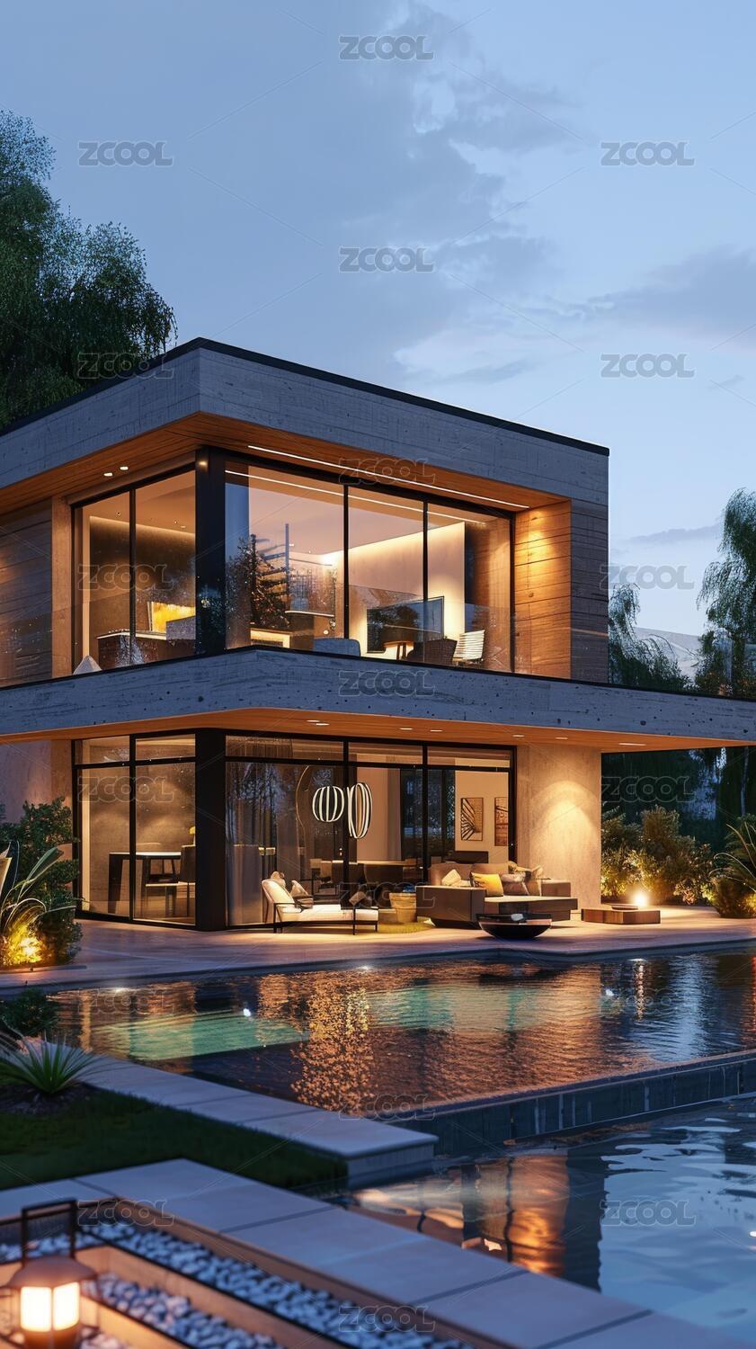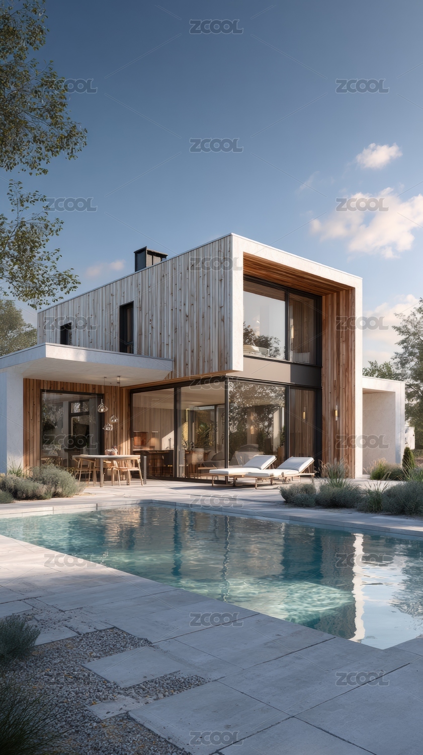 现代木质别墅与泳池