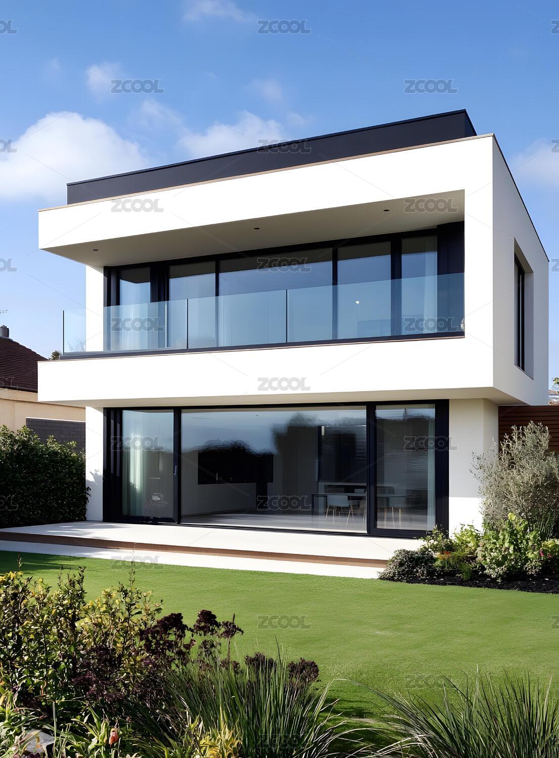玻璃幕墙,现代建筑,蓝天白云,建筑设计,双层住宅,简洁设计,户外草坪,自然景观,宽敞阳台,几何造型