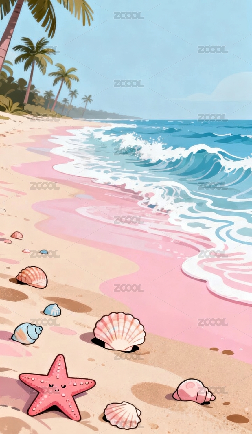 海滩风景与粉色海星贝壳