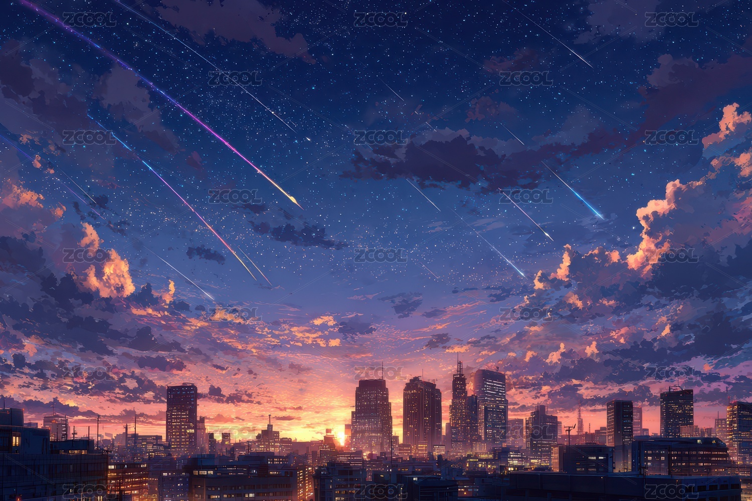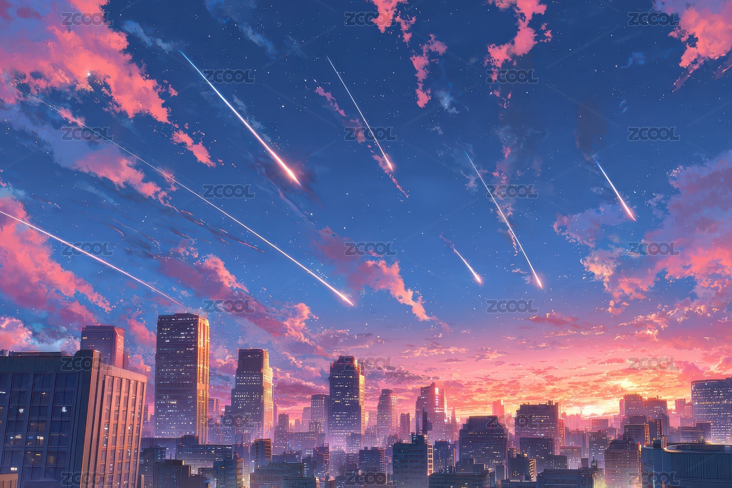 城市,建筑,云彩,流星,夜空,灯光,黄昏,天际