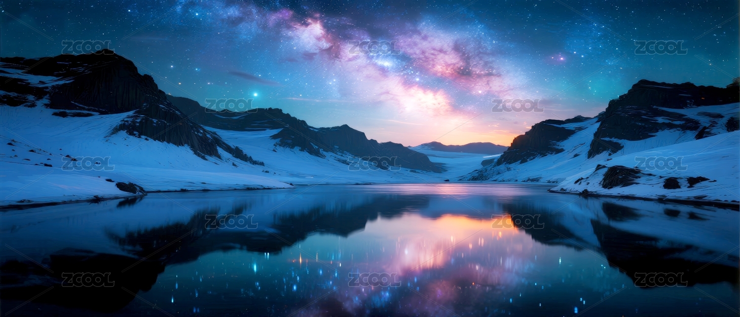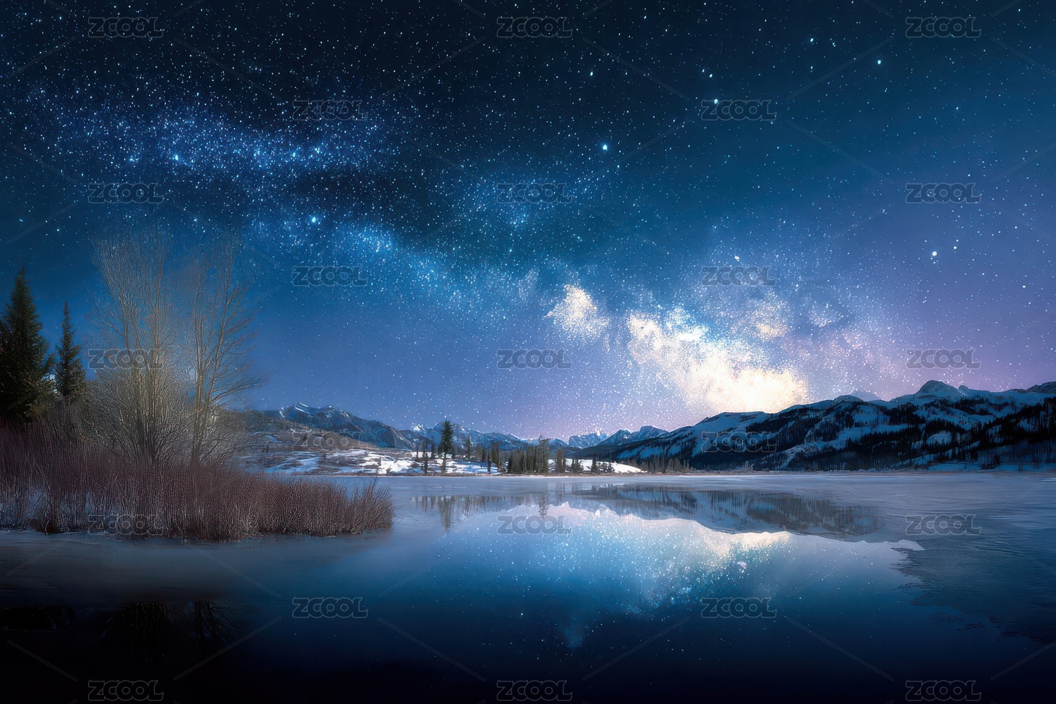 雪山,夜空,银河,湖面,倒影,松树,静谧,冬景