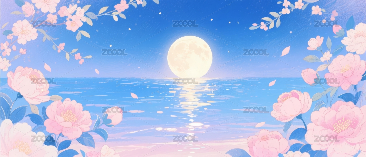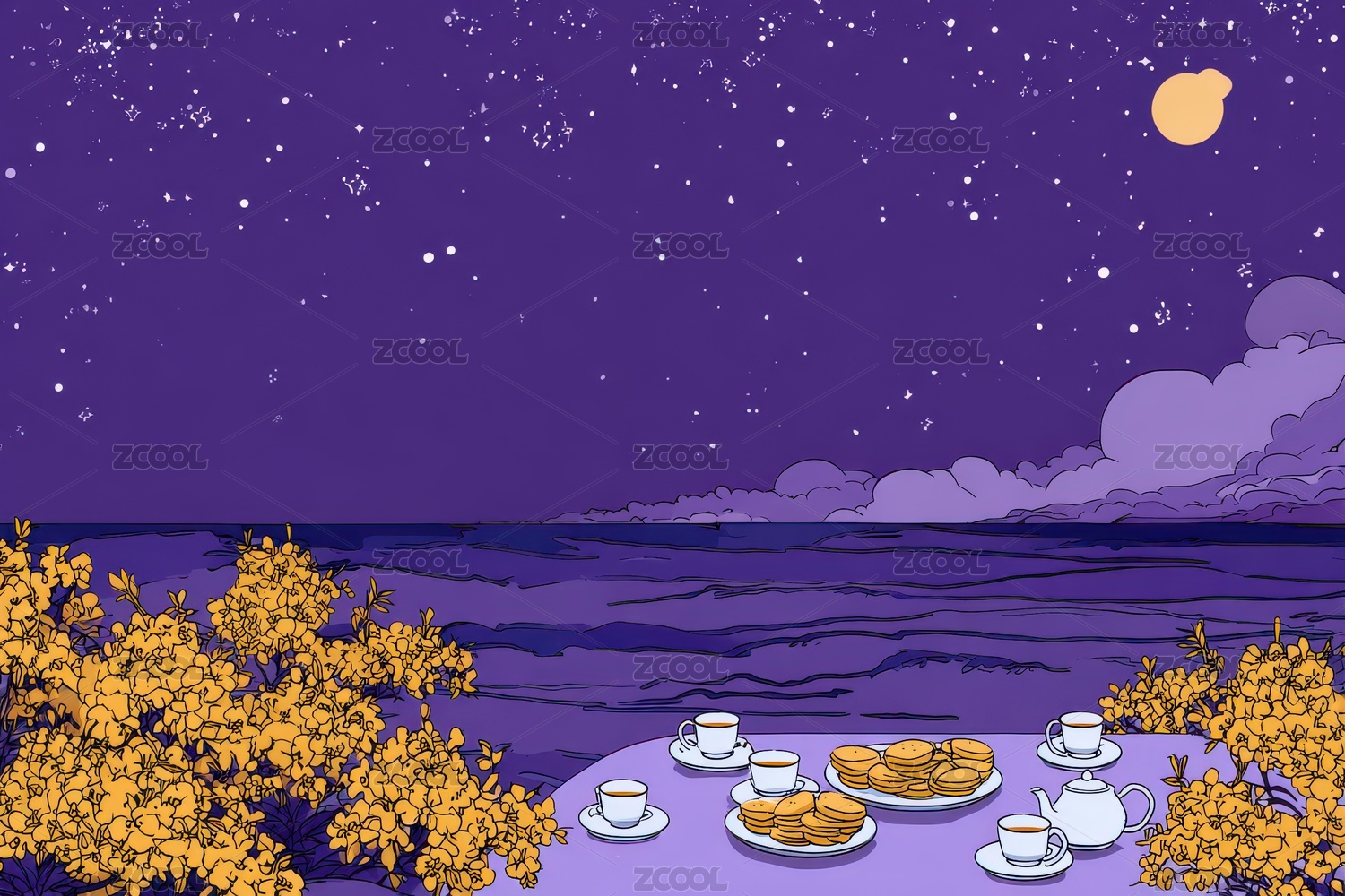 夜空,星星,月亮,饼干,茶壶,花朵,圆桌,海岸