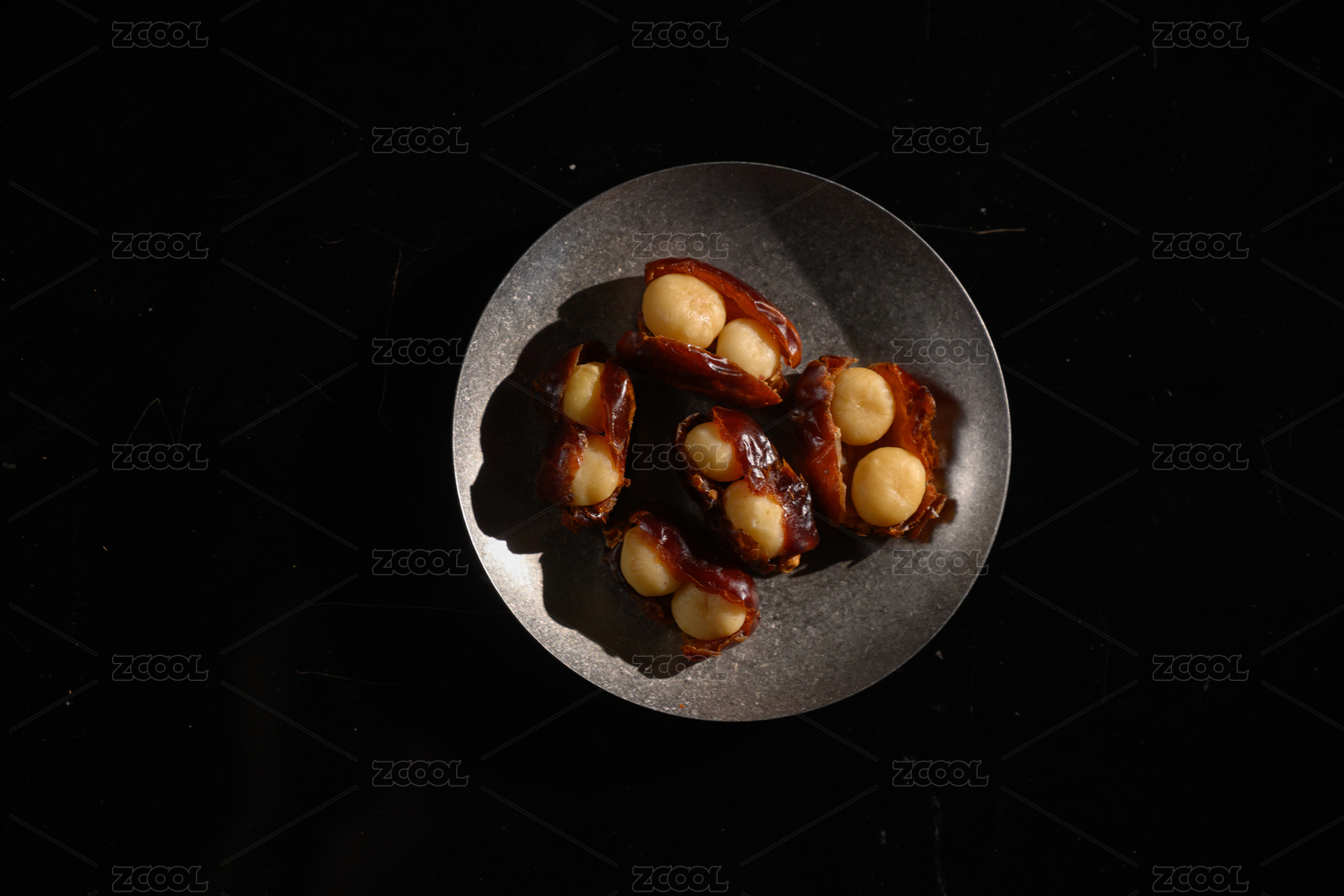桌面上的盘子里的美味可口的椰枣夏威夷果仁
