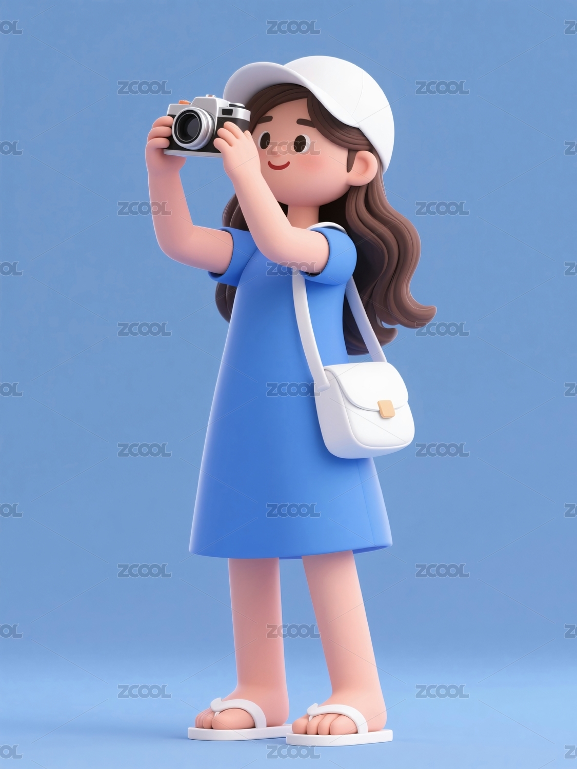 可爱女孩戴着帽子拿着相机拍照3D卡通插画