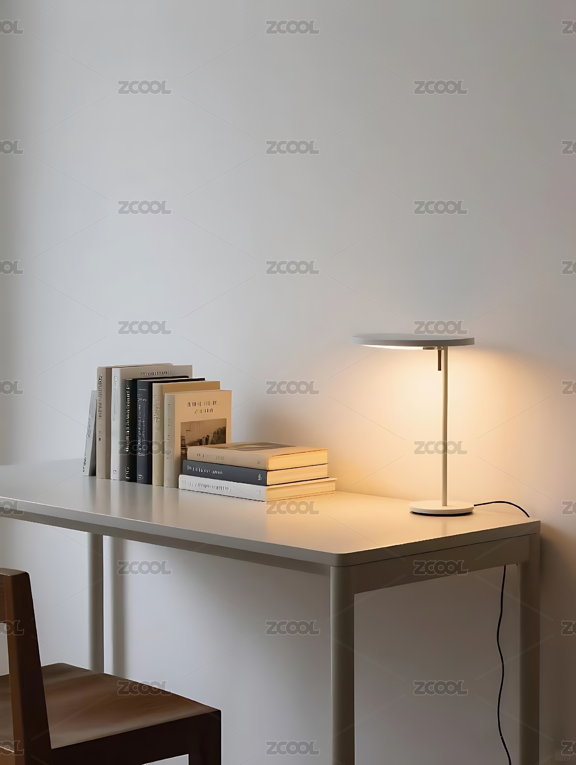 书桌,台灯,暖光,书籍,堆叠,素墙,简约,静谧,整洁,空间