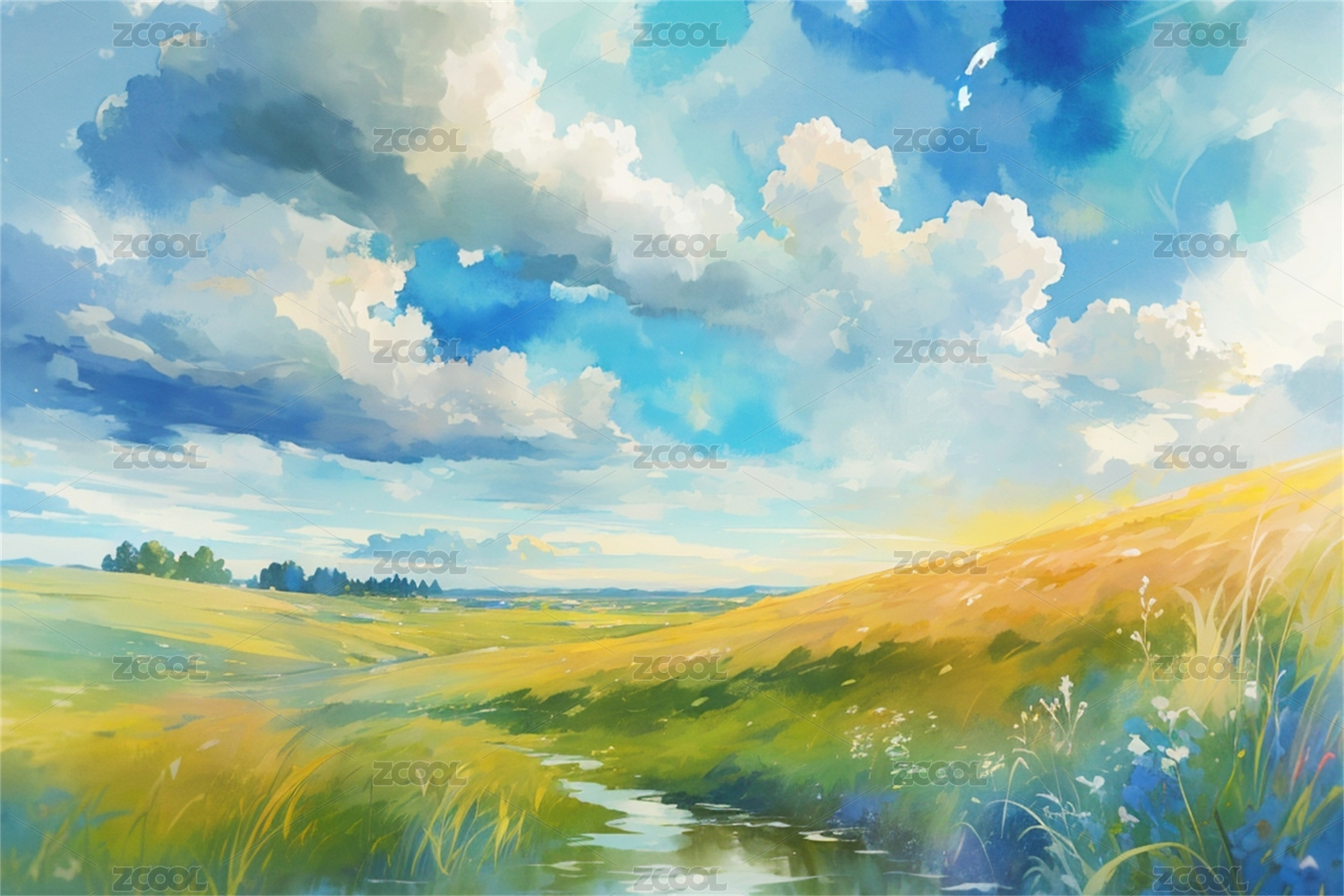 水彩晕染风格风景,蓝天白云,淡黄色草木