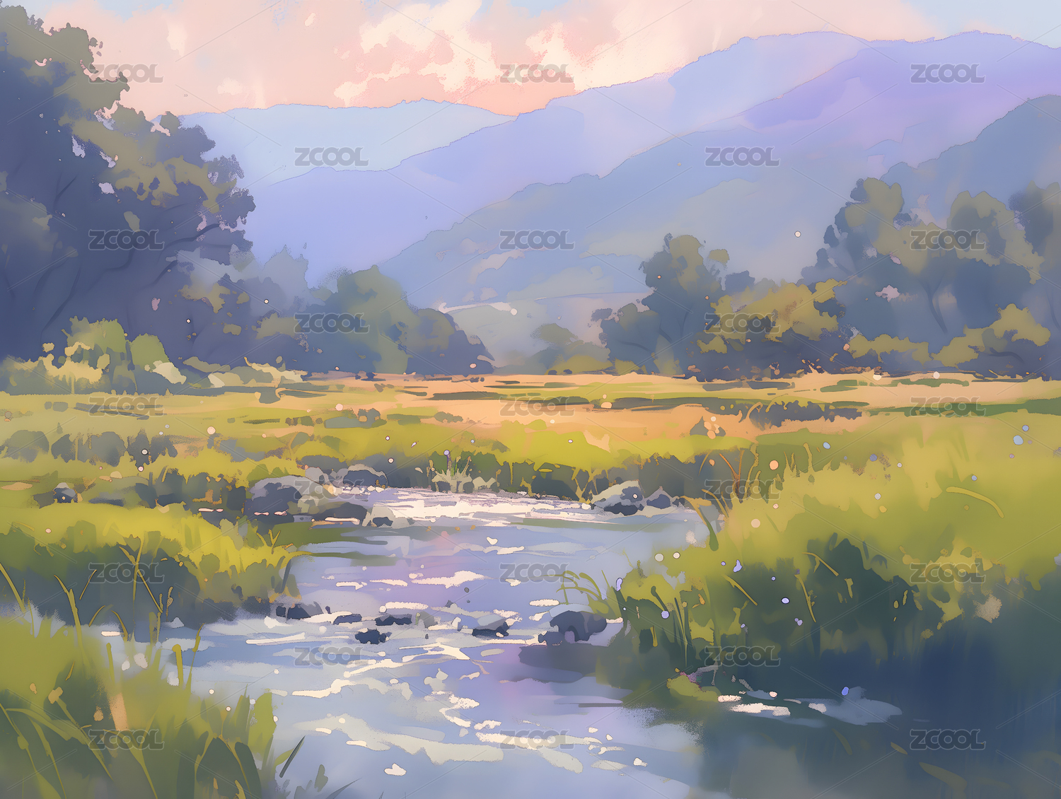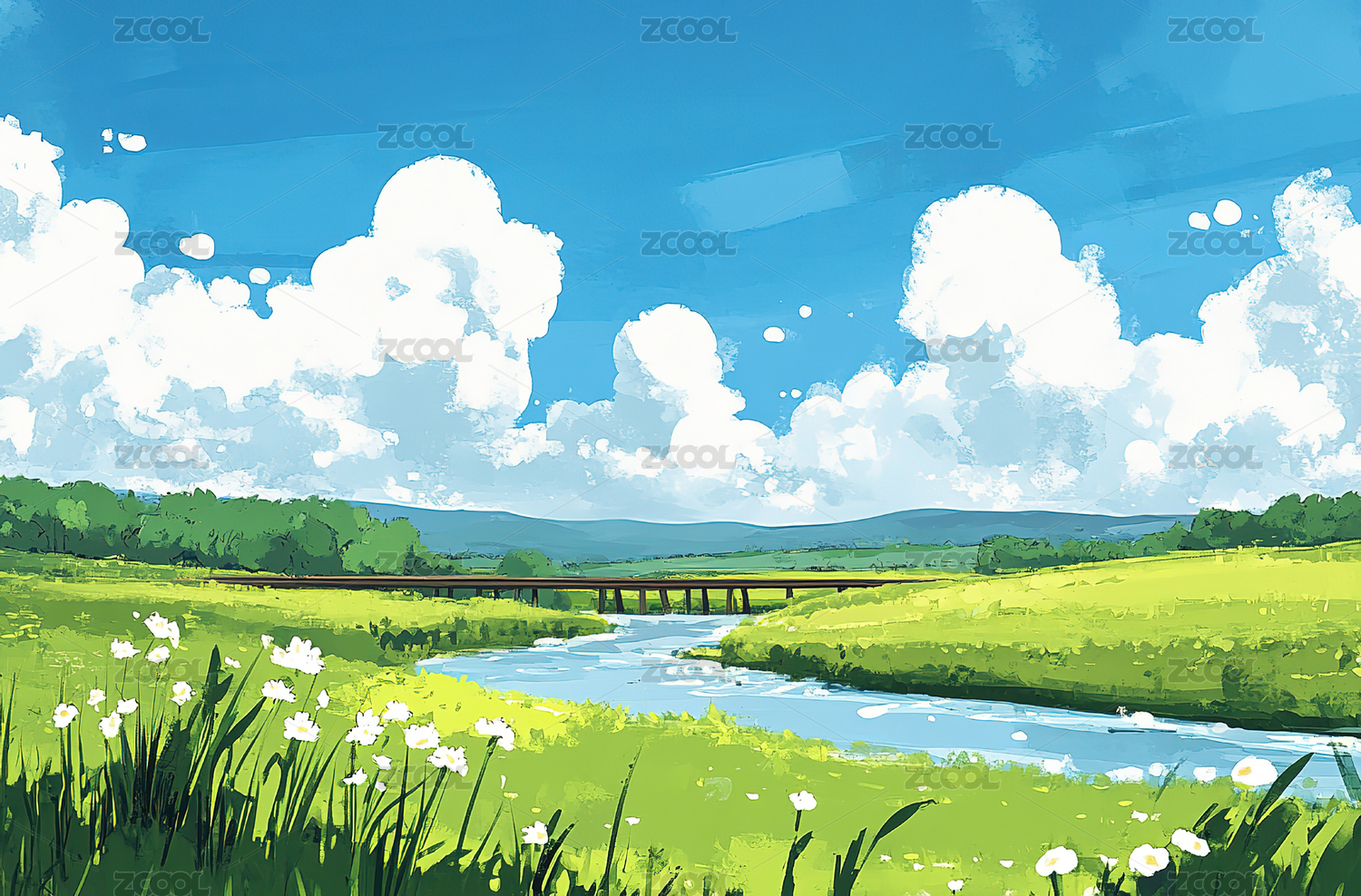 河流,草地,树木,天空,云朵,风景,自然,插画,风景画,户外