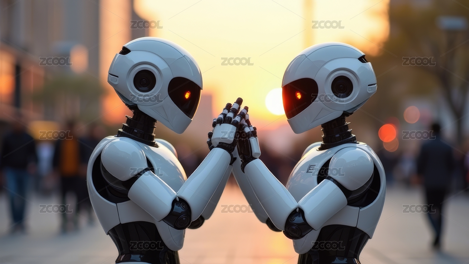 未来感机器人城市黄昏互动图