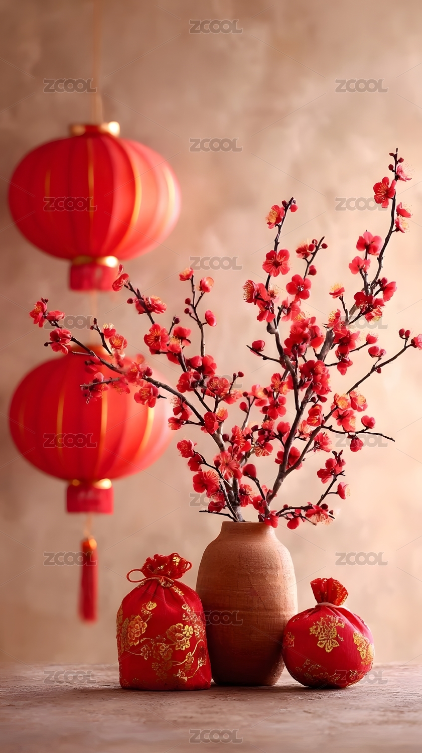 红色灯笼与梅花枝的节日装饰