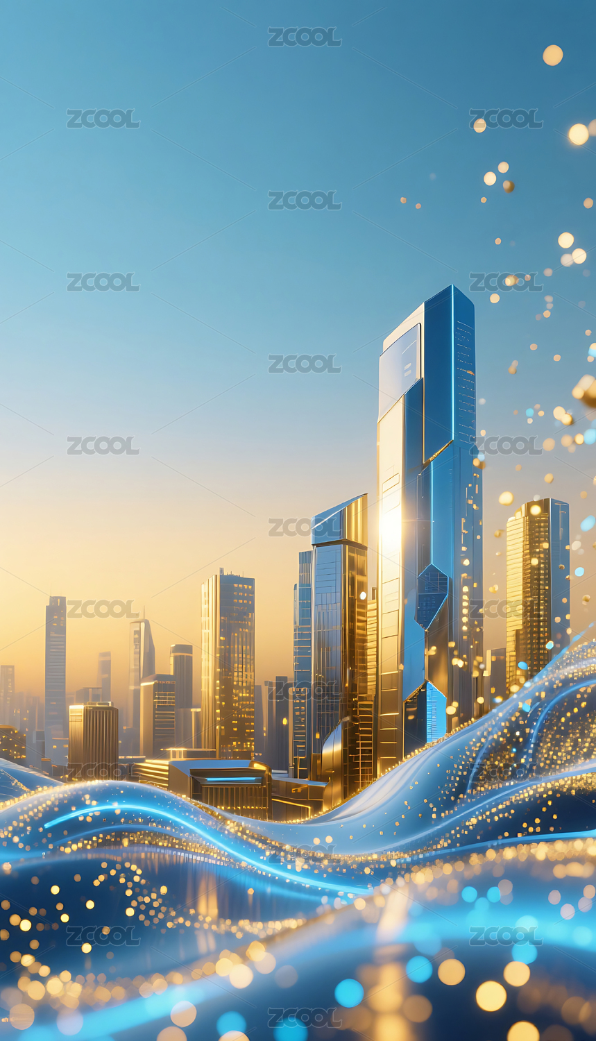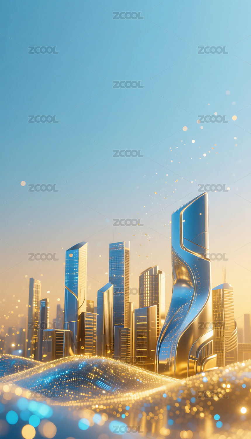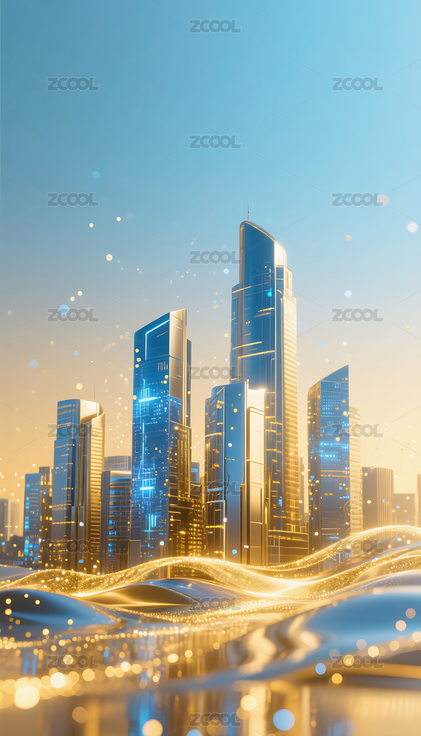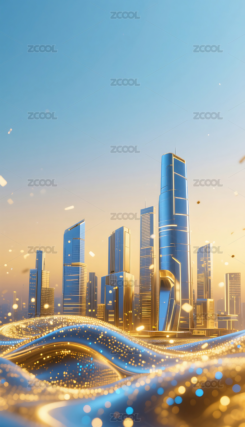 蓝金色流动粒子金属城市建筑背景