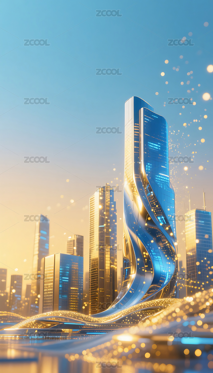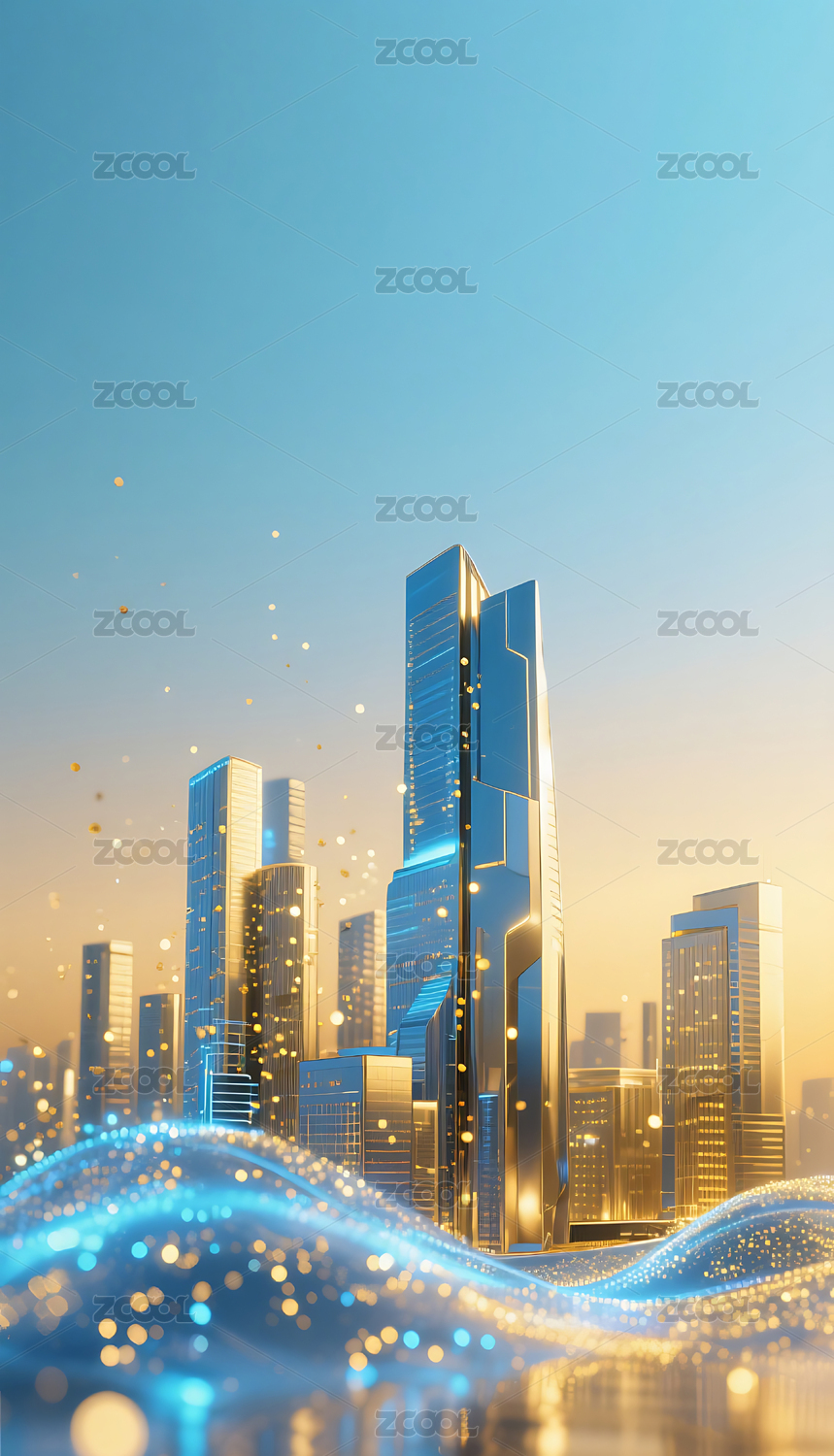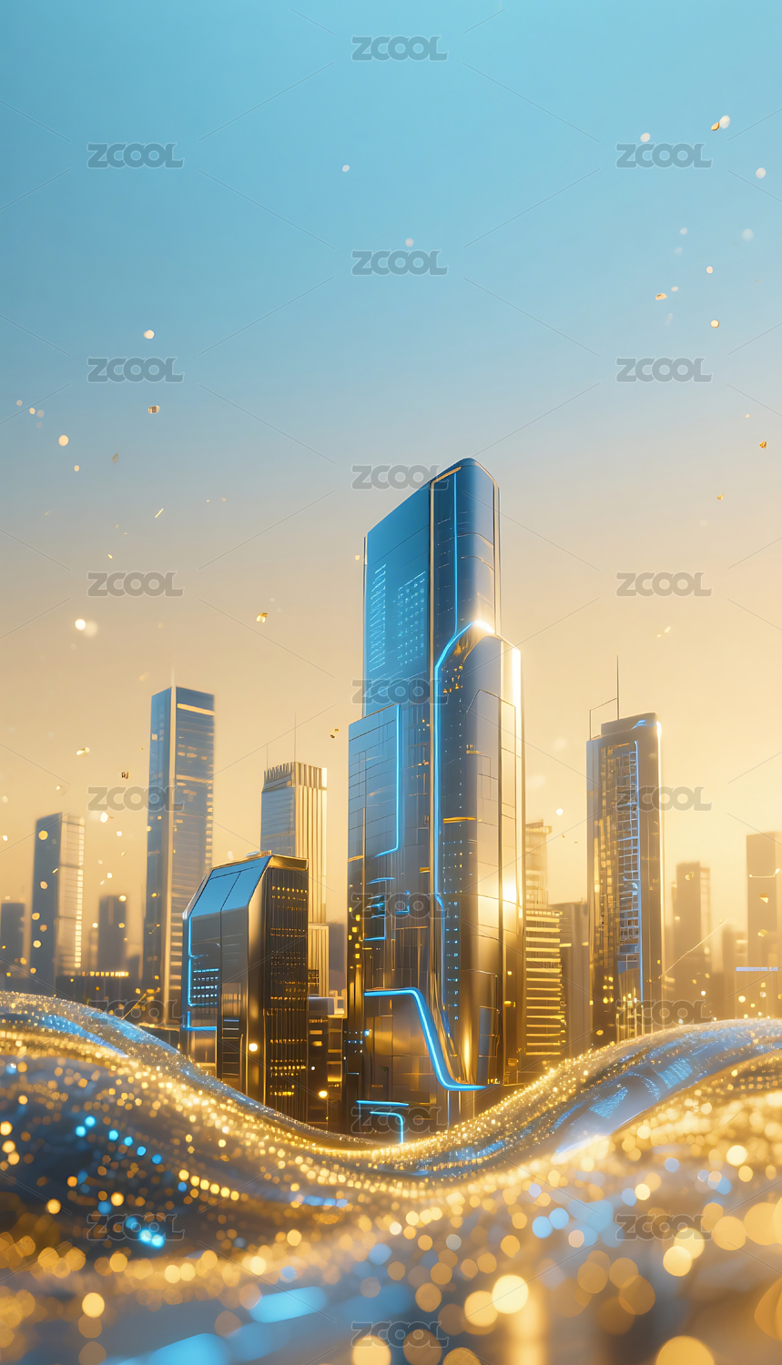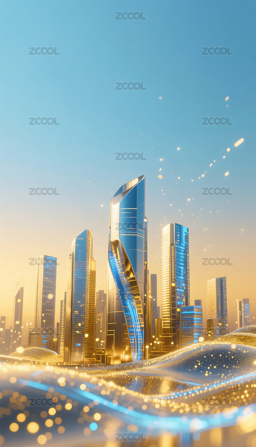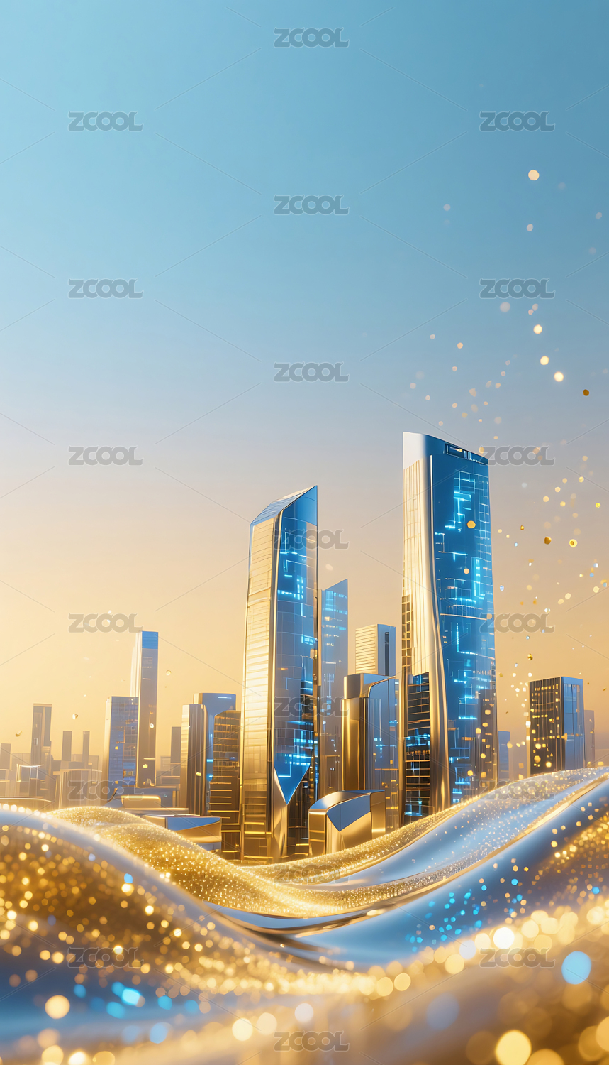 蓝金色流动粒子金属城市建筑背景