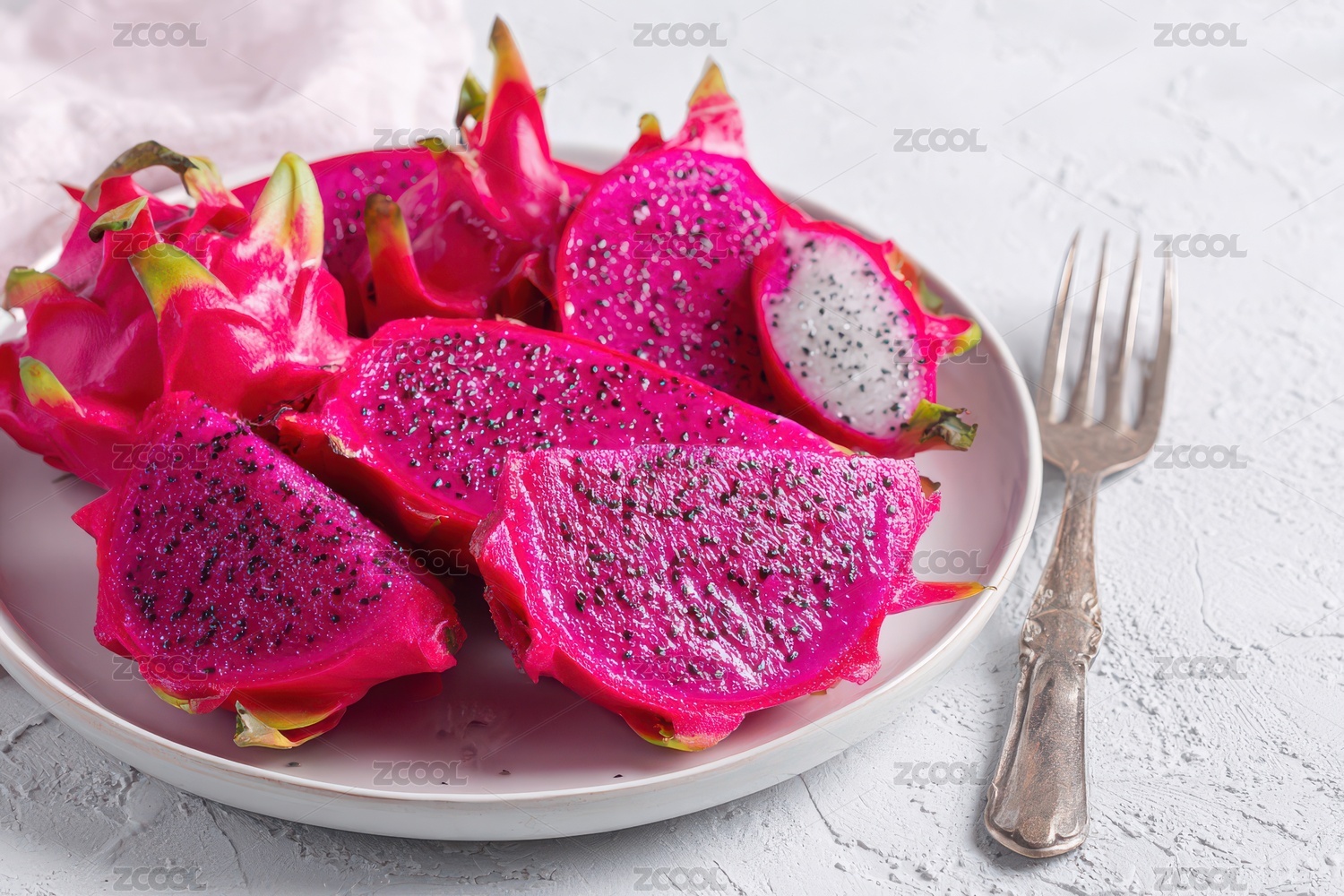 背景,果肉,粉色,质感,火龙果,切片,黑籽,盘子,叉子