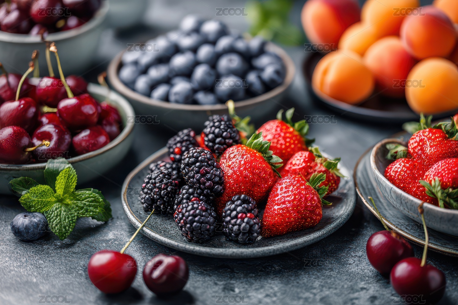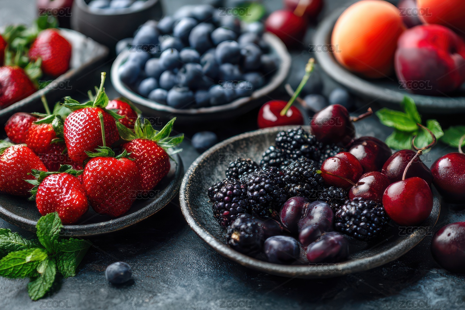 盘子,水果,浆果,桃子,草莓,蓝莓,黑莓,樱桃,杨梅,薄荷