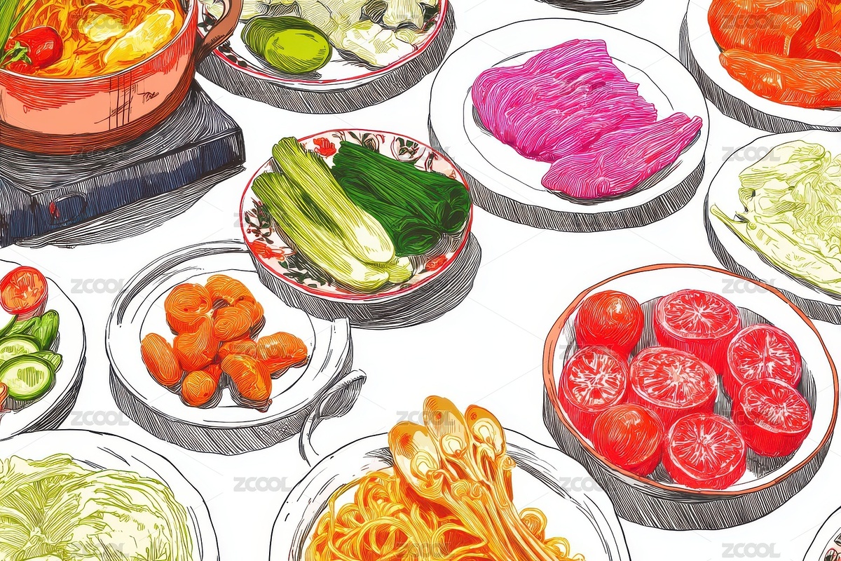 柠檬,食材,插画,蔬菜,火锅,肉类,虾类,面条