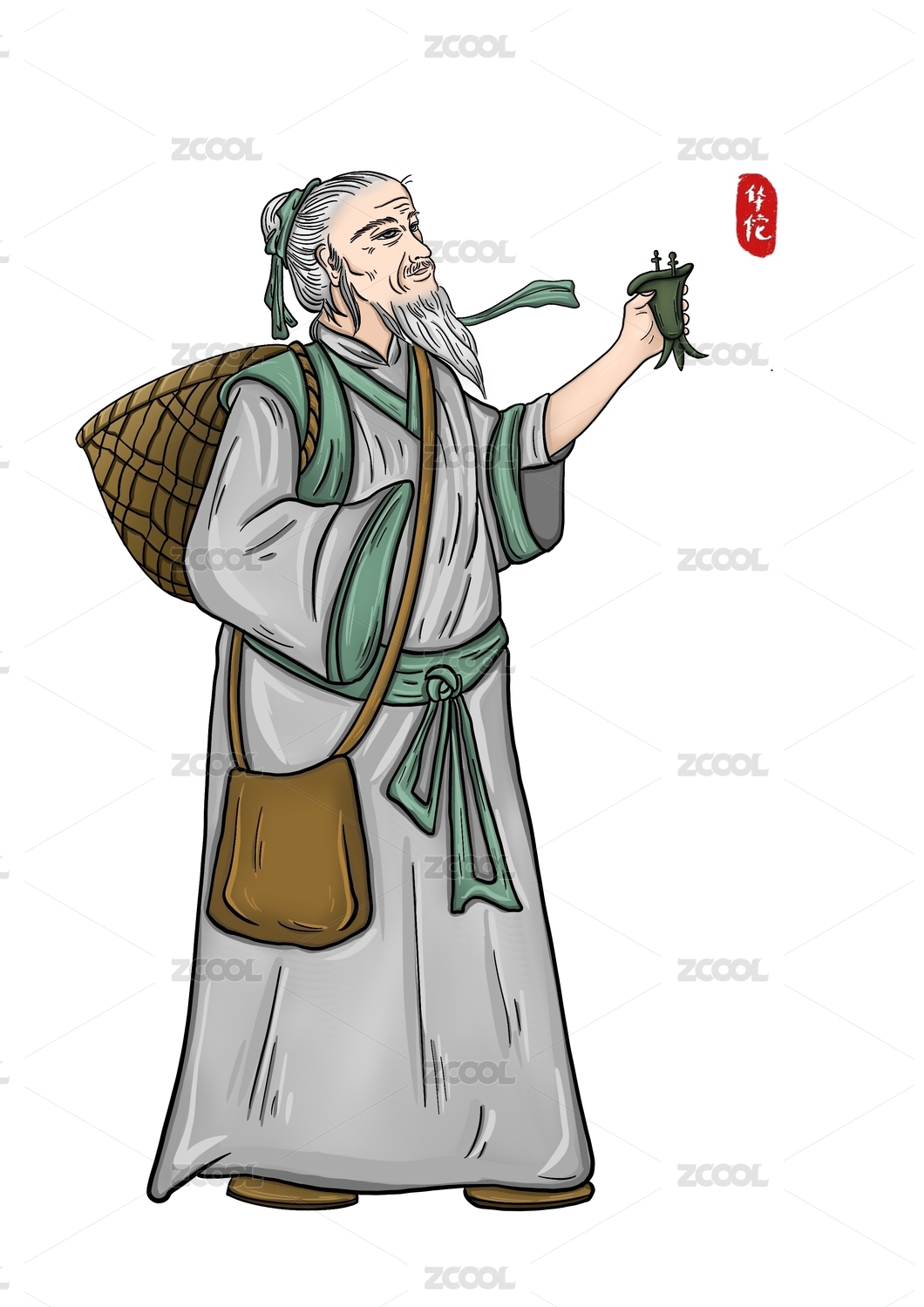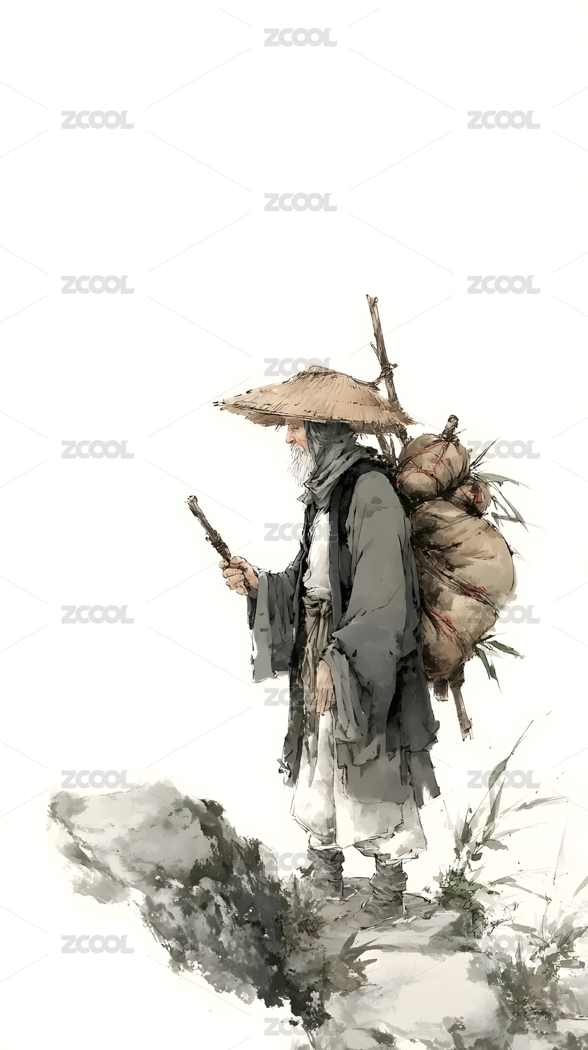 白胡子老者戴着斗笠背着竹筐中药叶子插画