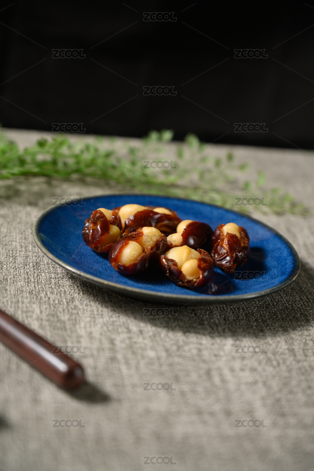 桌面上的盘子里的美味可口的椰枣夏威夷果仁