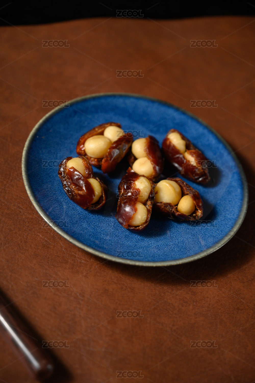 桌面上的盘子里的美味可口的椰枣夏威夷果仁