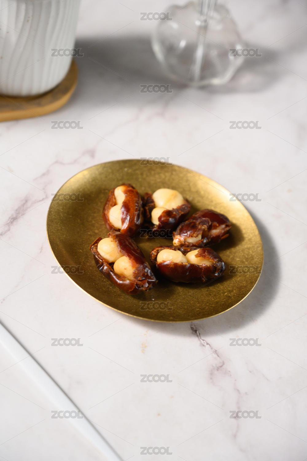 桌面上的盘子里的美味可口的椰枣夏威夷果仁