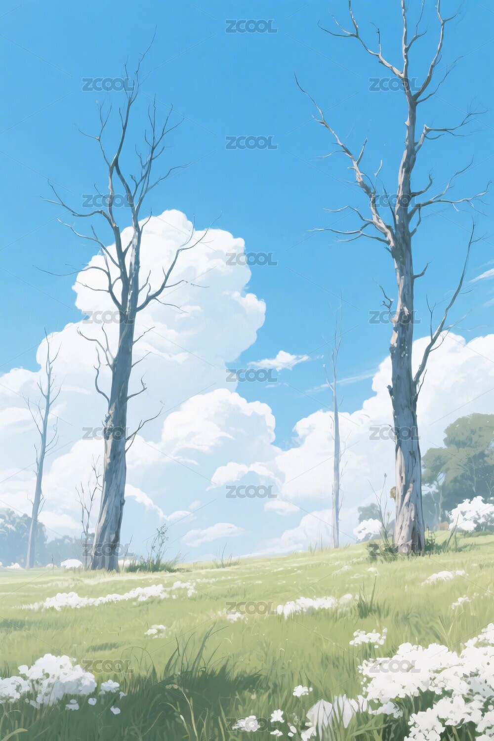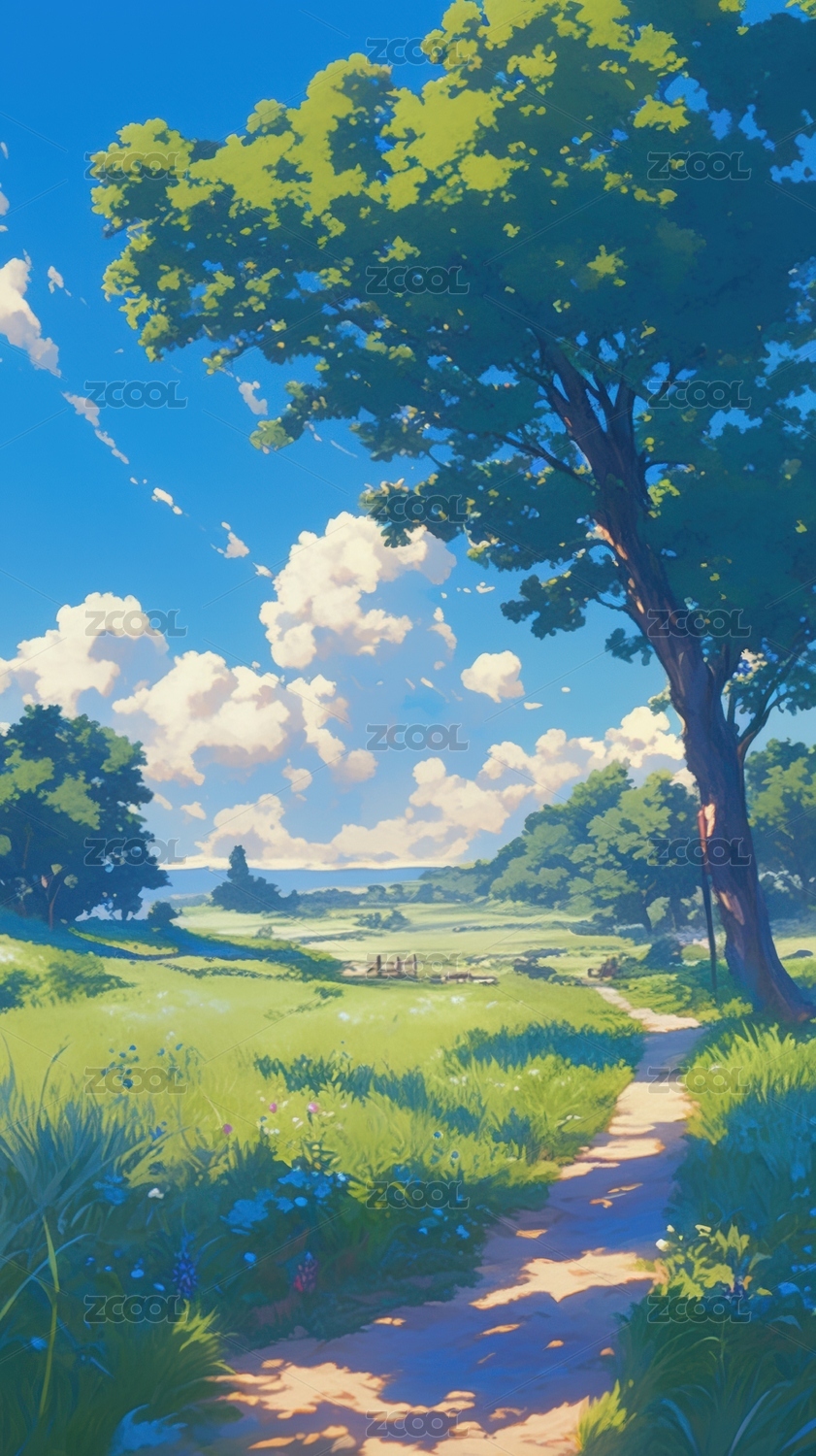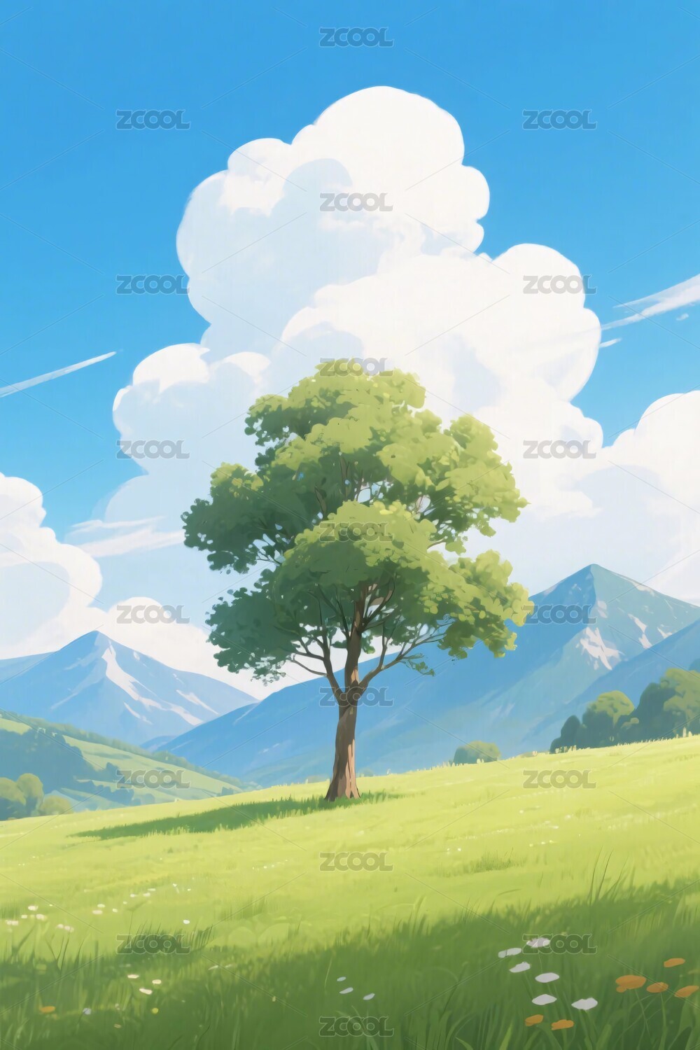 自然,宁静,蓝天,白云,绿草,大树,风筝,阳光,田野,清新