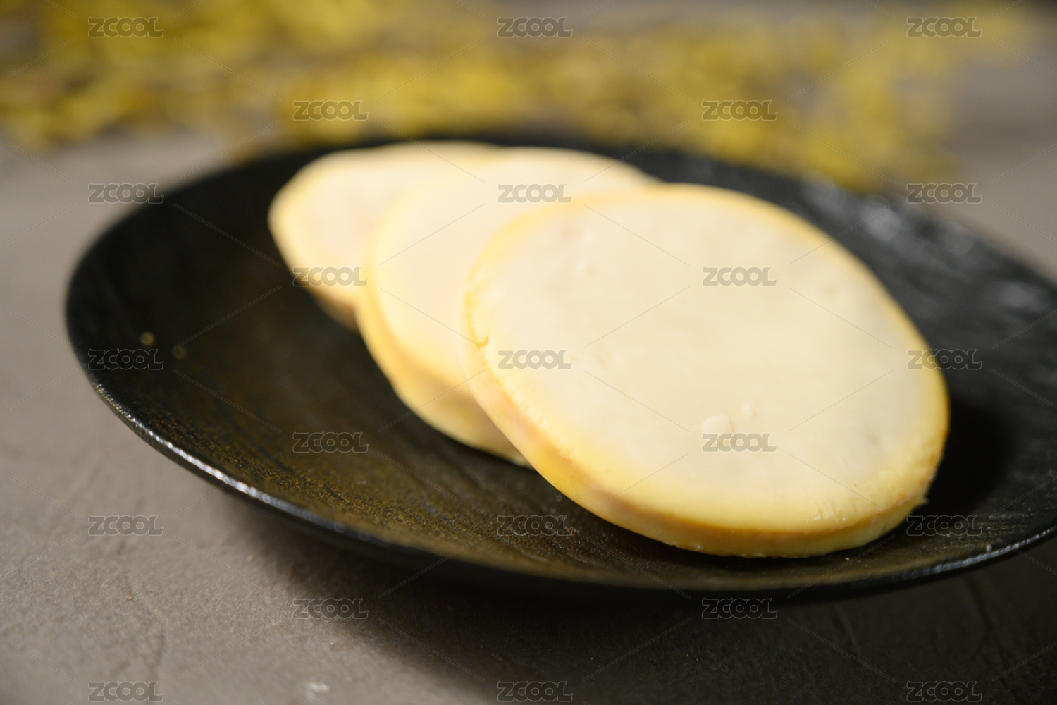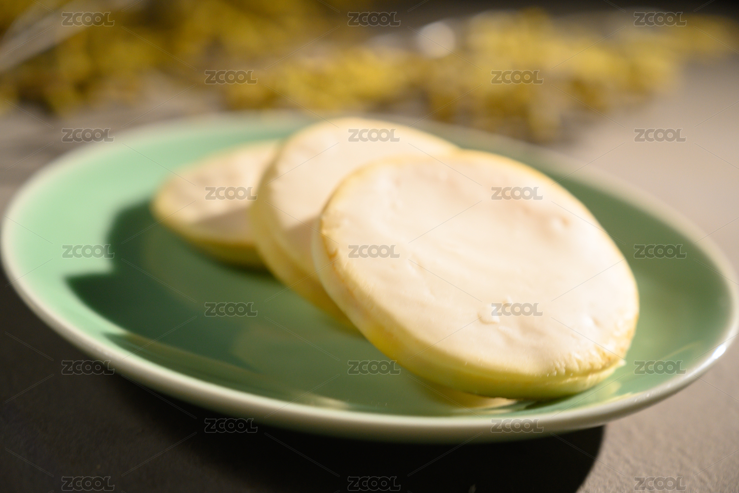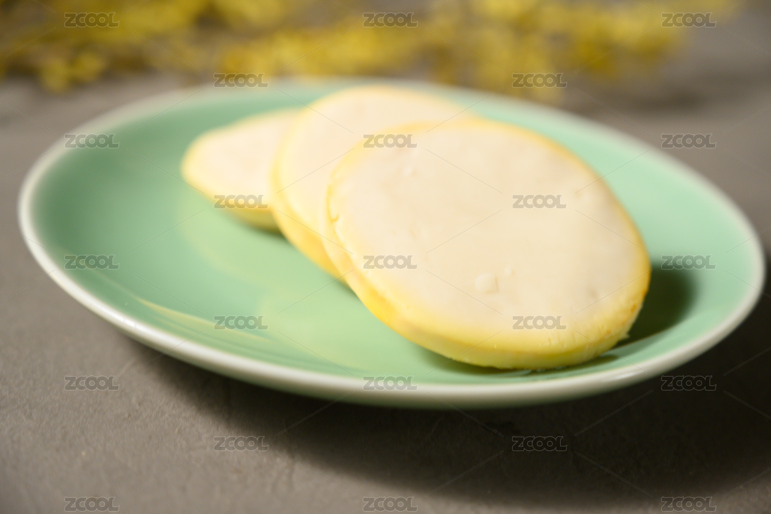 桌面上的盘子里的美味可口的白巧克力橙子片