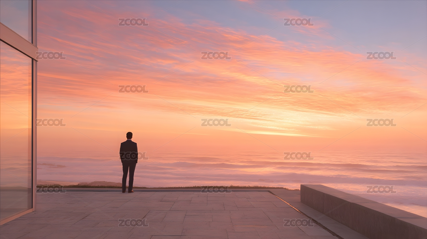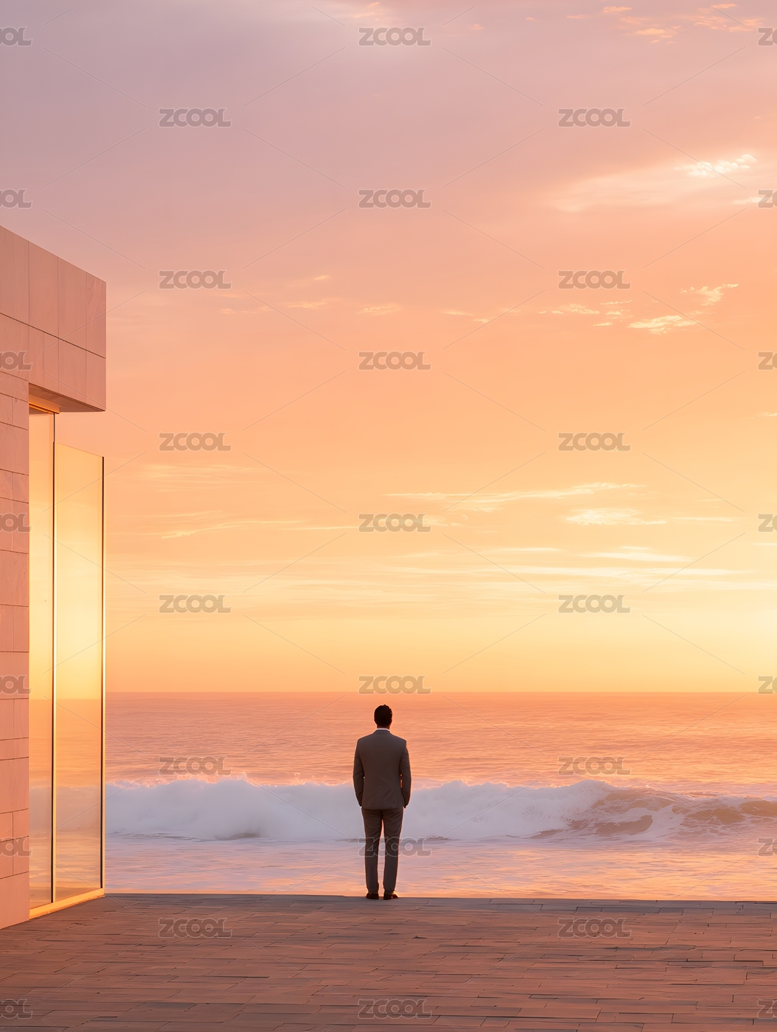 海边,大海,夕阳,建筑,天空,霞光,远方,男人,海面,云彩