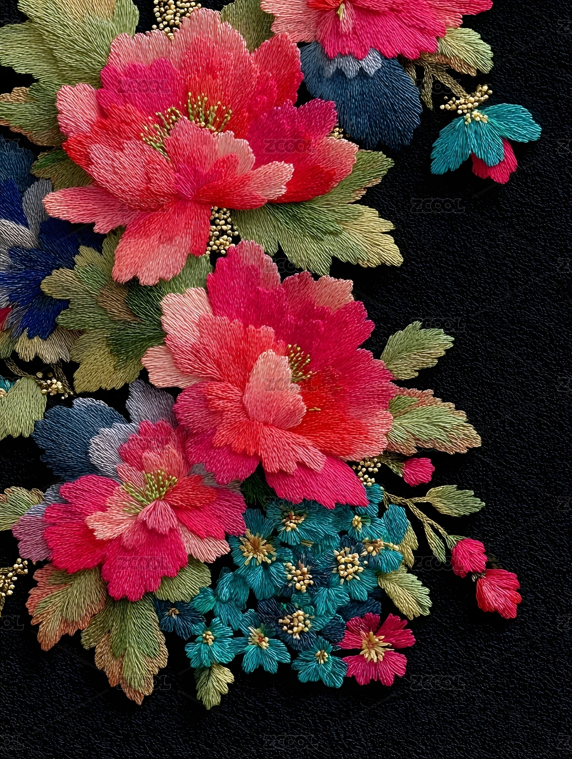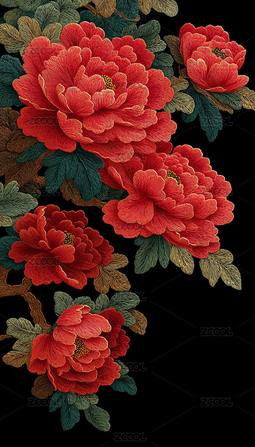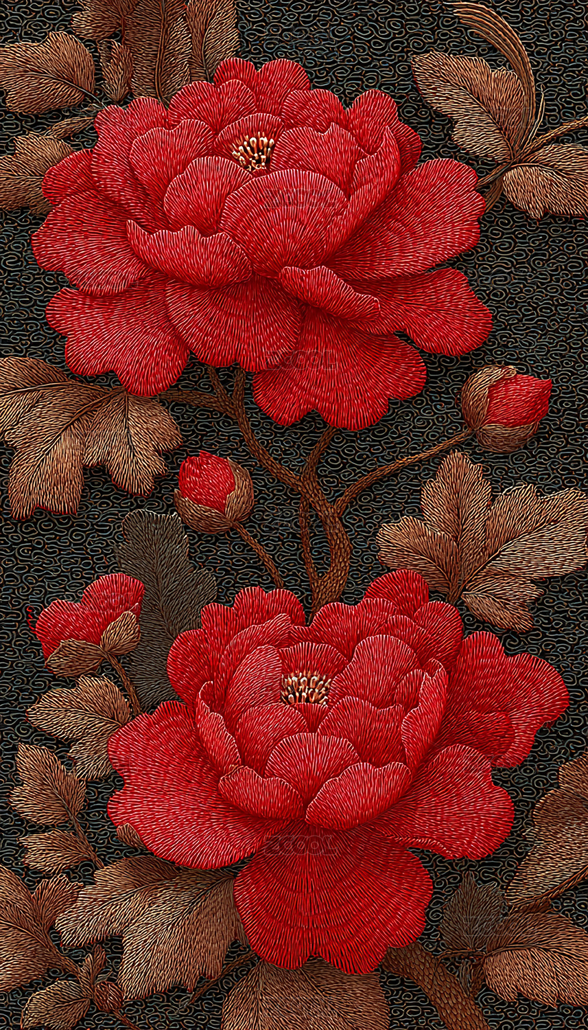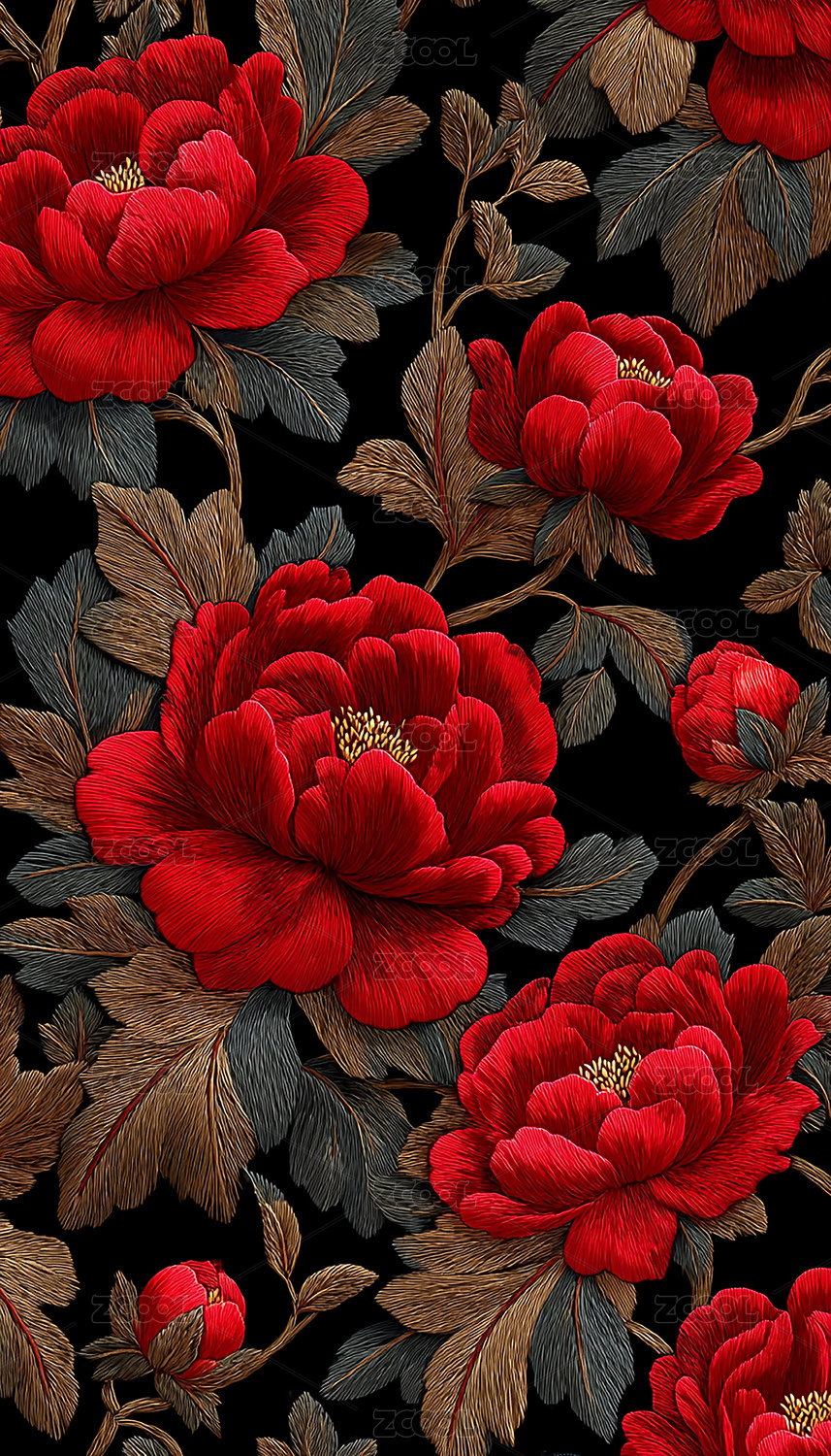 刺绣,红牡丹,花卉图案,棕色叶子,黑色底布,植物纹样,手工刺绣,花朵装饰