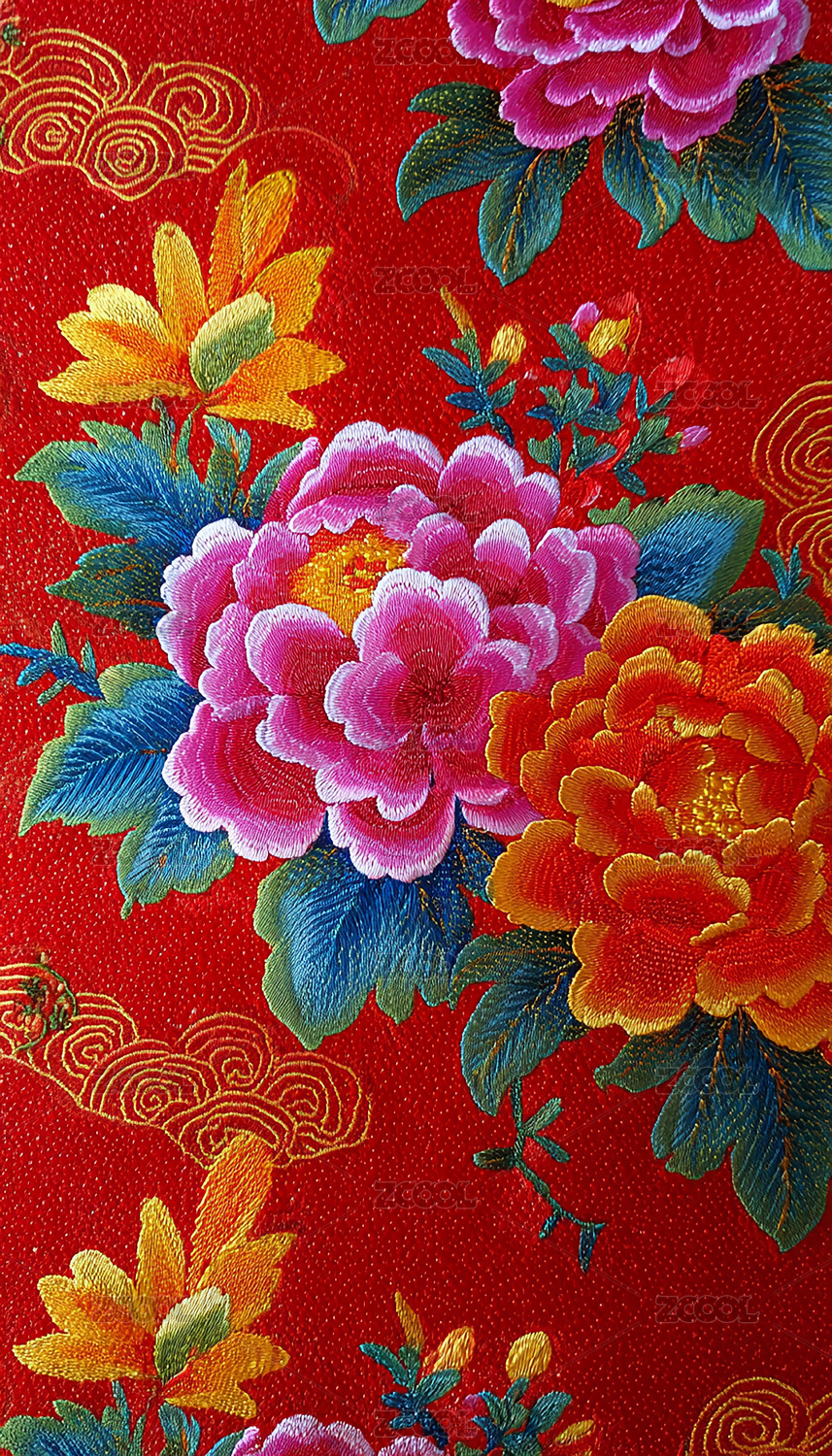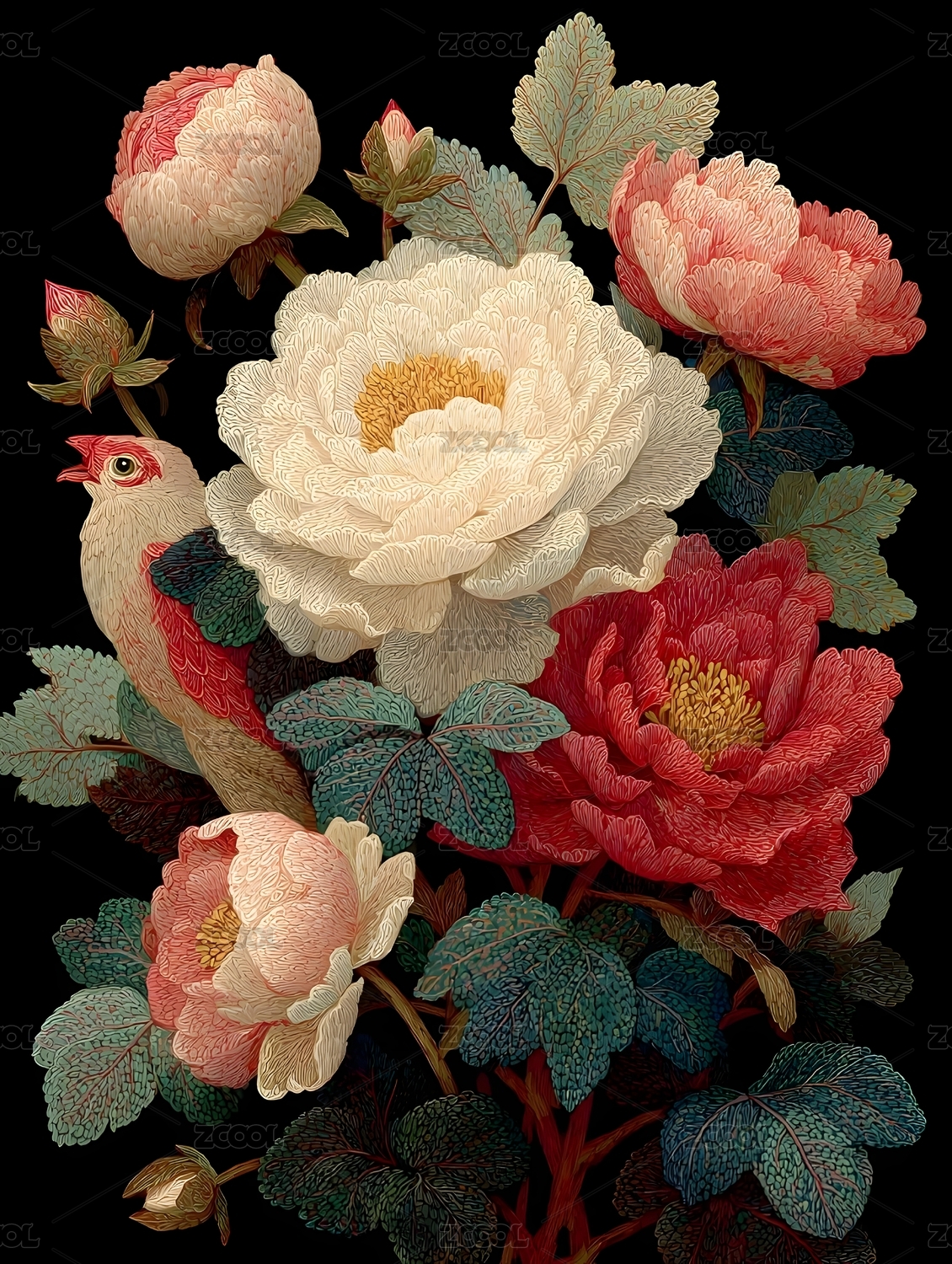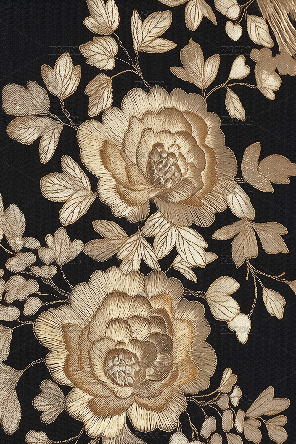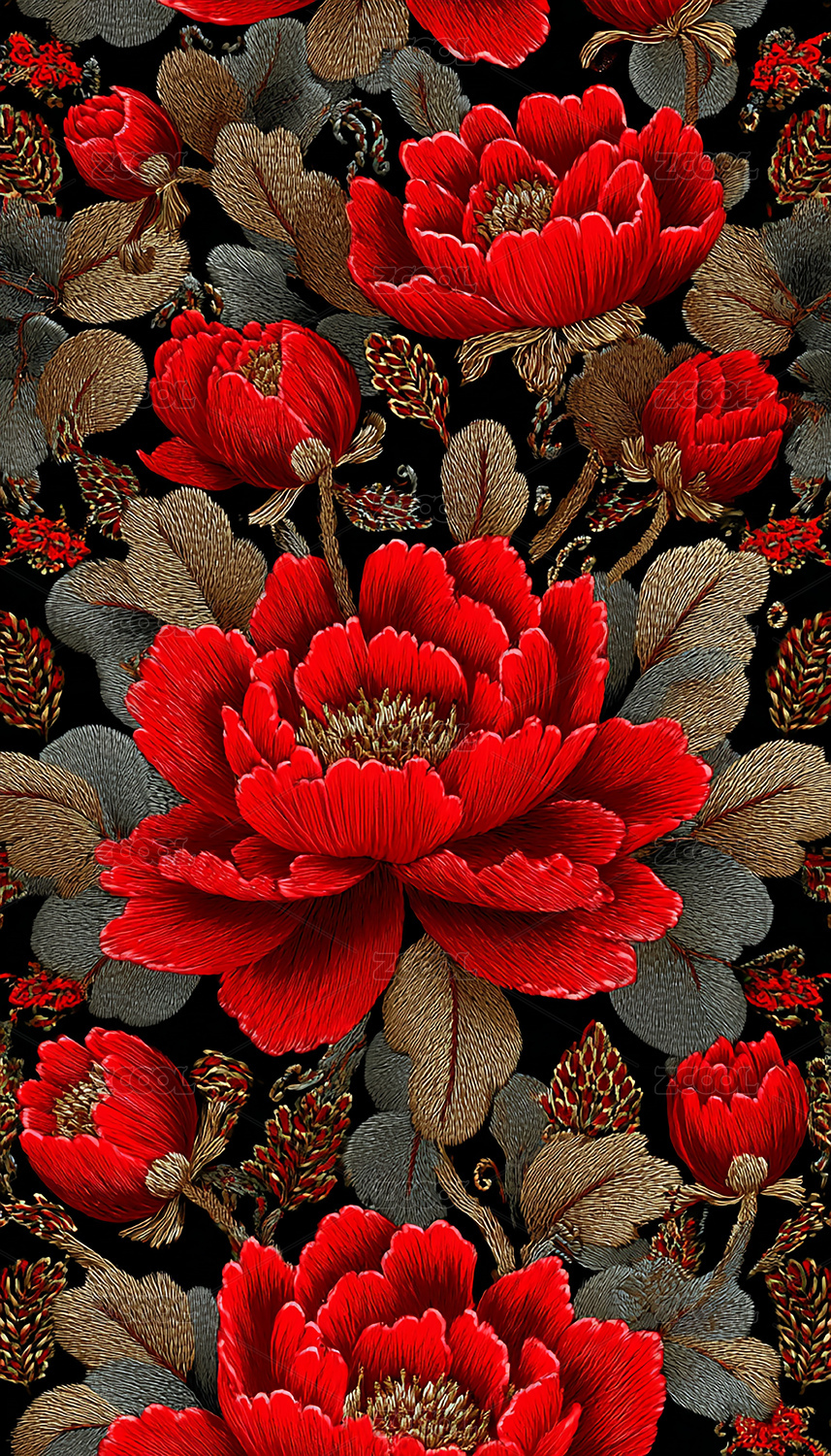 刺绣,红牡丹,花卉图案,棕色叶子,黑色底布,植物纹样,手工刺绣,花朵装饰