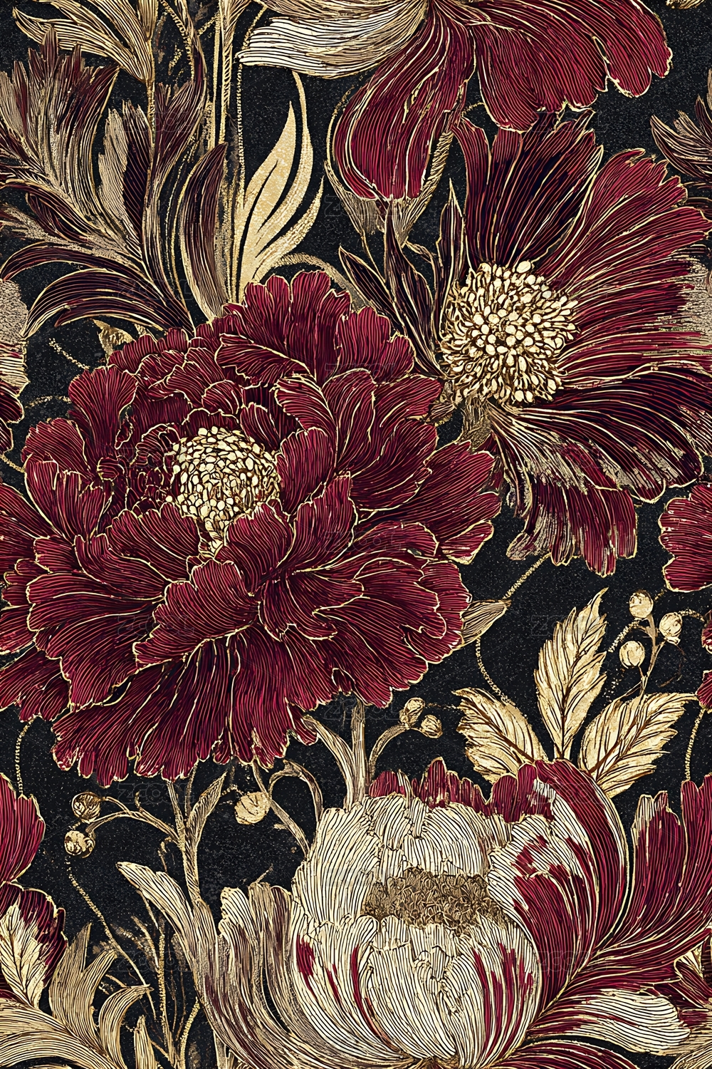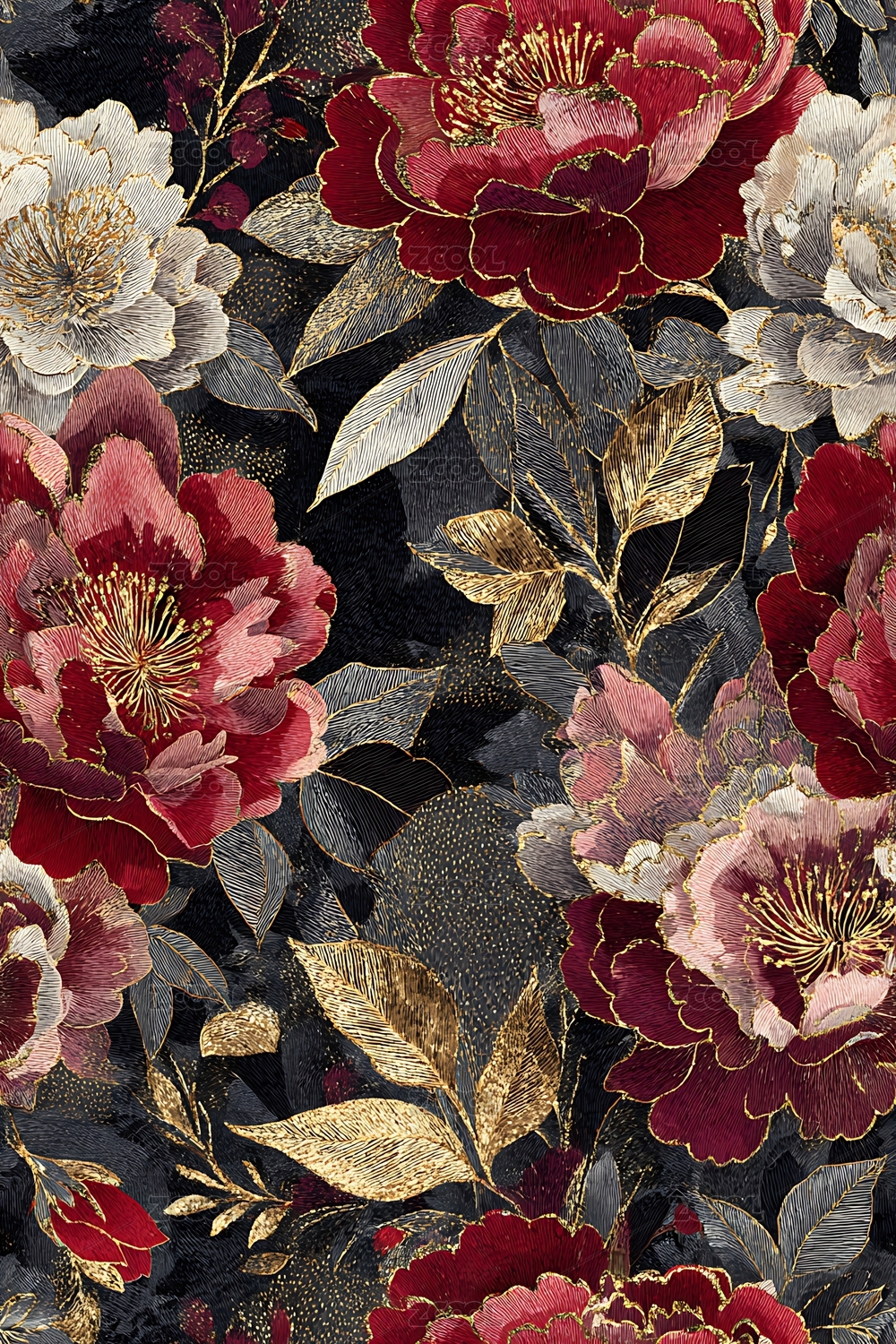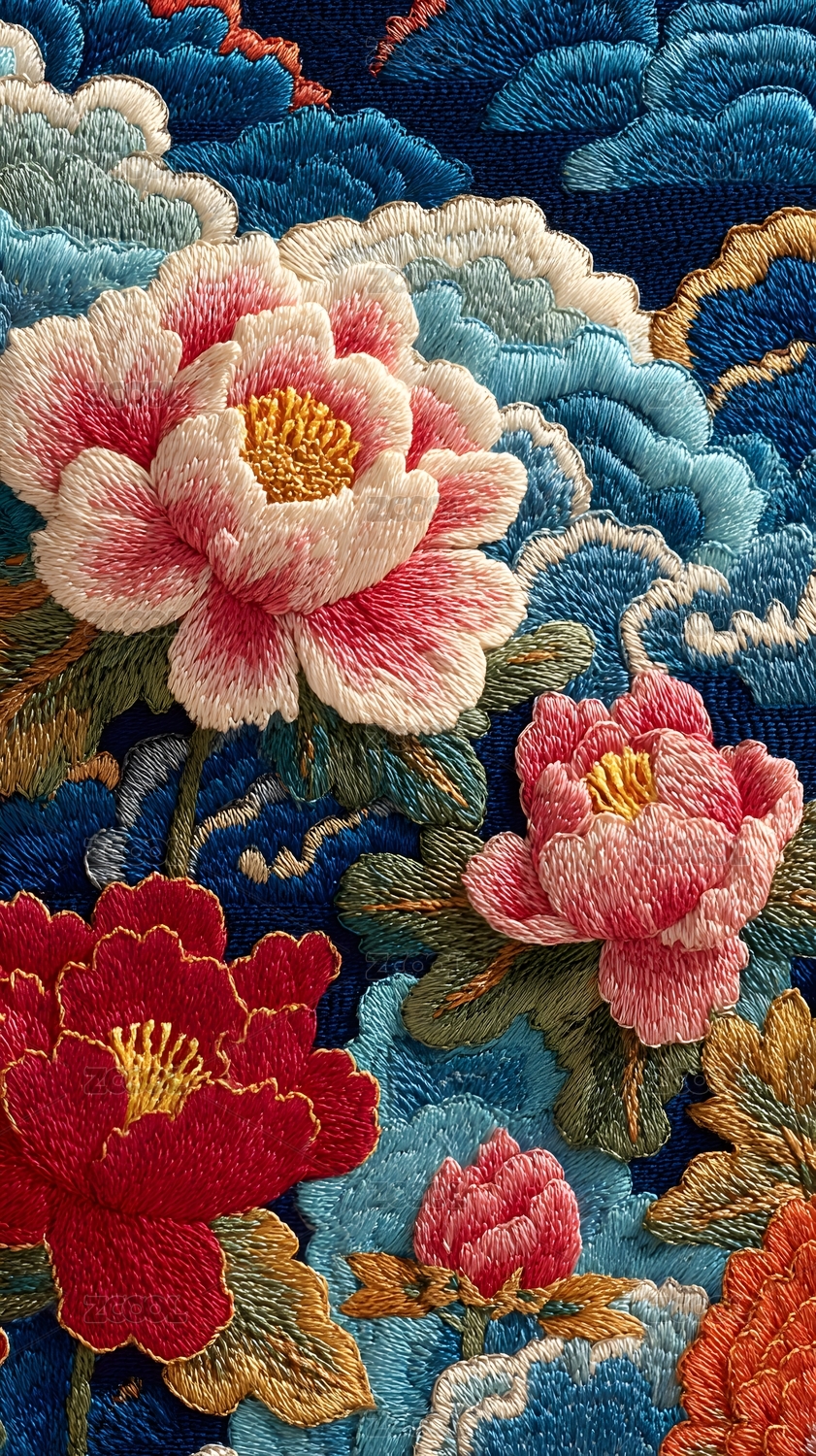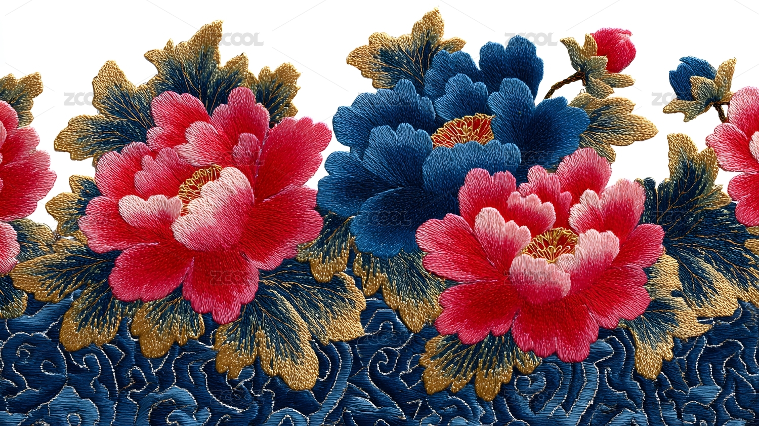 刺绣,红牡丹,花卉图案,棕色叶子,黑色底布,植物纹样,手工刺绣,花朵装饰